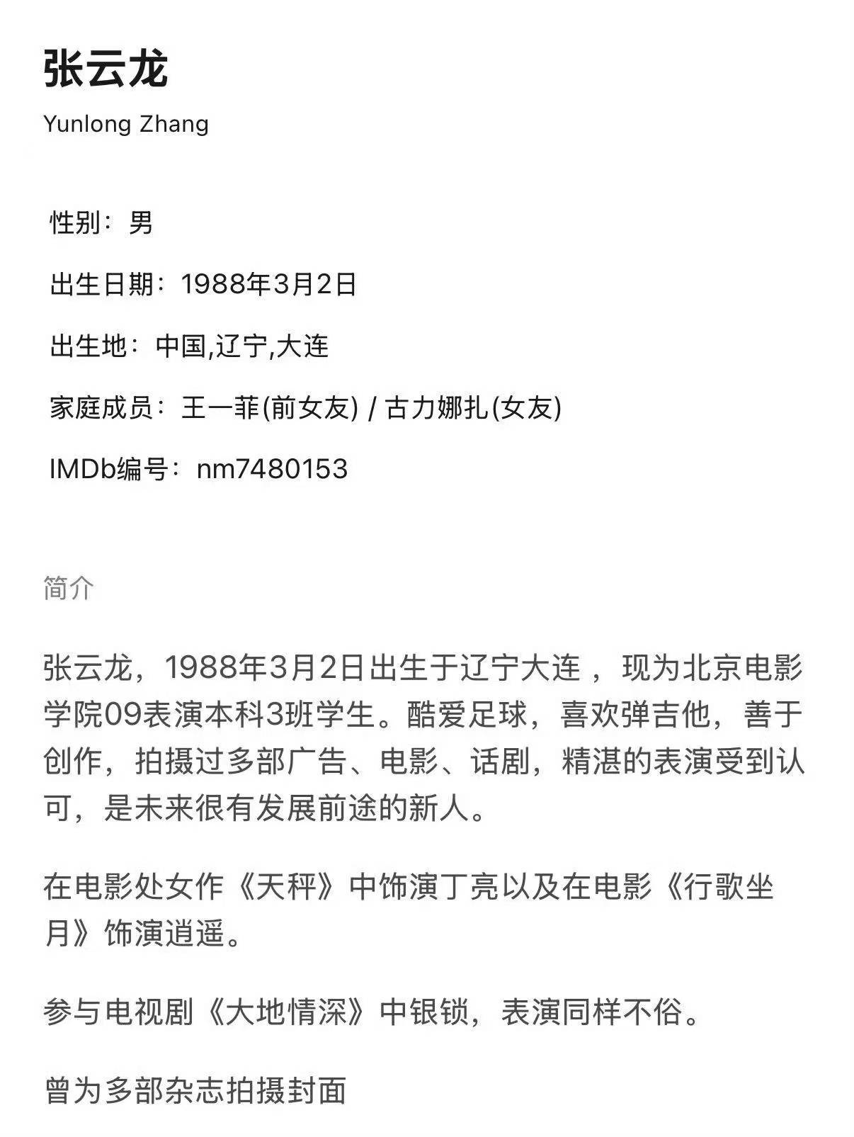 张云龙简介张云龙豆瓣简介变动,女友栏成古力娜扎。他有着阳光般的笑容,在演艺界努力拼搏。