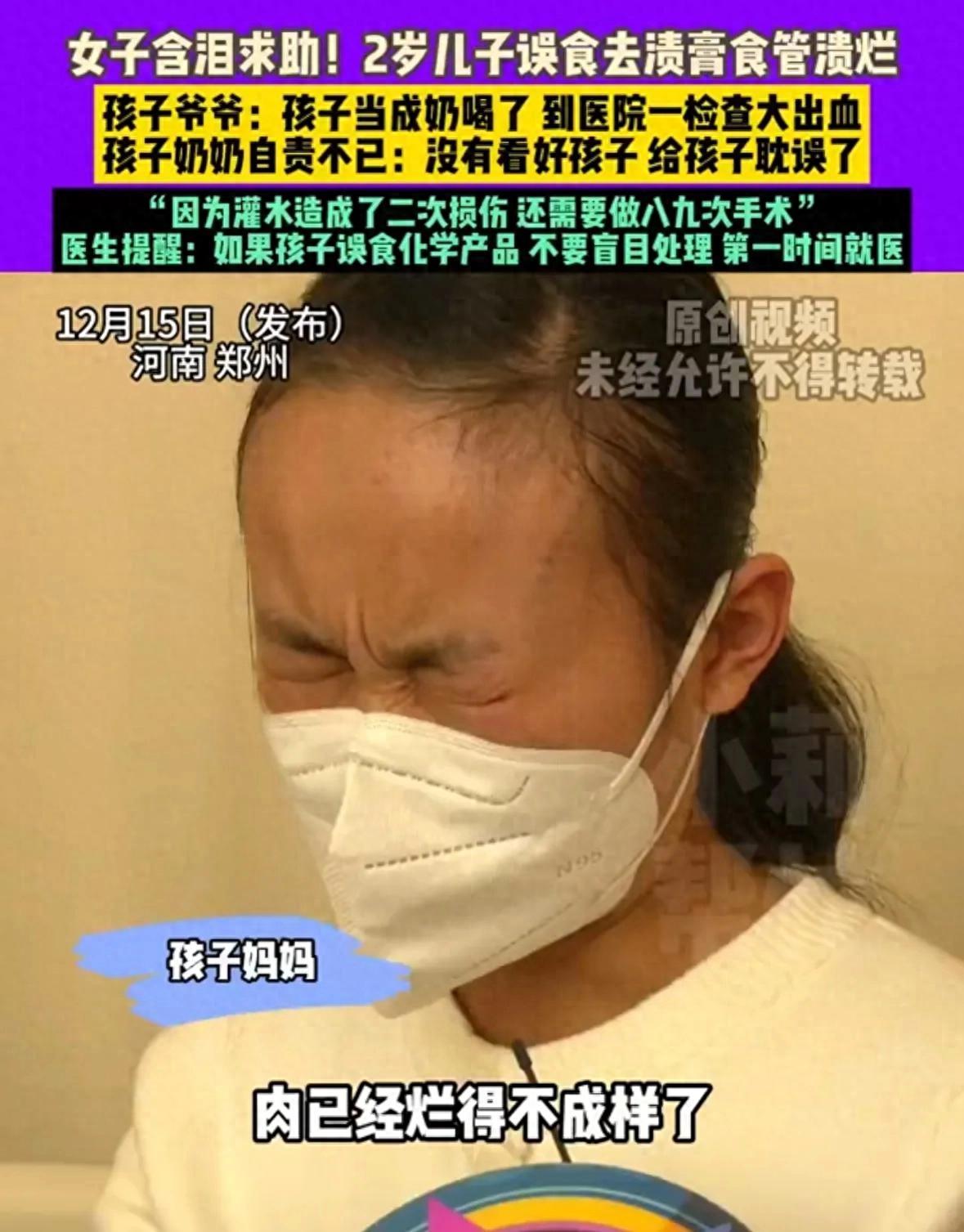 谁能想到,奶奶的一个"救命"举动,差点要了2岁孙子的命! 这事儿发生在河南郑州,看完我整个人都不好了。 奶奶在打扫卫生,2岁的小孙子乐乐在一旁玩耍。瓶子里装着白色液体,孩子以为是酸奶,拿起来就往嘴里倒。那是去污膏啊! 等奶奶发现的时候,孩子嘴角已经开始起泡,口腔食管当场就溃烂了。奶奶吓坏了,脑子一热,赶紧给孩子灌水想把东西冲下去。 就是这一灌,彻底完了。 本来化学物质可能还只停留在嘴里,这水一冲,直接把腐蚀性物质冲进肠胃里去了!送到医院一检查,肠胃被腐蚀大出血。 医生说了:误食化学物品,千万别自己瞎处理,第一时间送医院! 现在孩子食管狭窄,后面还要做八九次手术。孩子妈妈哭着说,手术费要近20万,家里三个孩子,女儿刚骨折出院,儿子又出事了。 奶奶自责得不行,天天抹眼泪:"没看好孩子,把孩子耽误了..." 说实话,这事儿能怪奶奶吗? 换成你,孩子吃了化学品,你第一反应是不是也想赶紧灌水冲掉?谁能想到这一冲反而更严重? 但话又说回来,去污膏为啥要装在让孩子能够得着的地方?为啥要用容易让孩子误认的容器装? 家里有孩子的,这类东西真的要锁起来啊! 你觉得这事儿该怪谁?奶奶的无知?还是家长的疏忽?评论区说说你的看法。