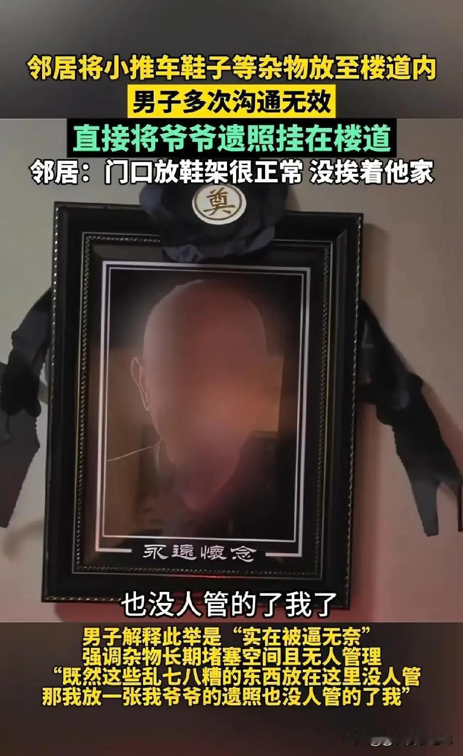 恶人还得恶人磨!邻居一直把鞋架跟杂物放在门口,物业干涉无果,于是男子将爷爷遗照挂