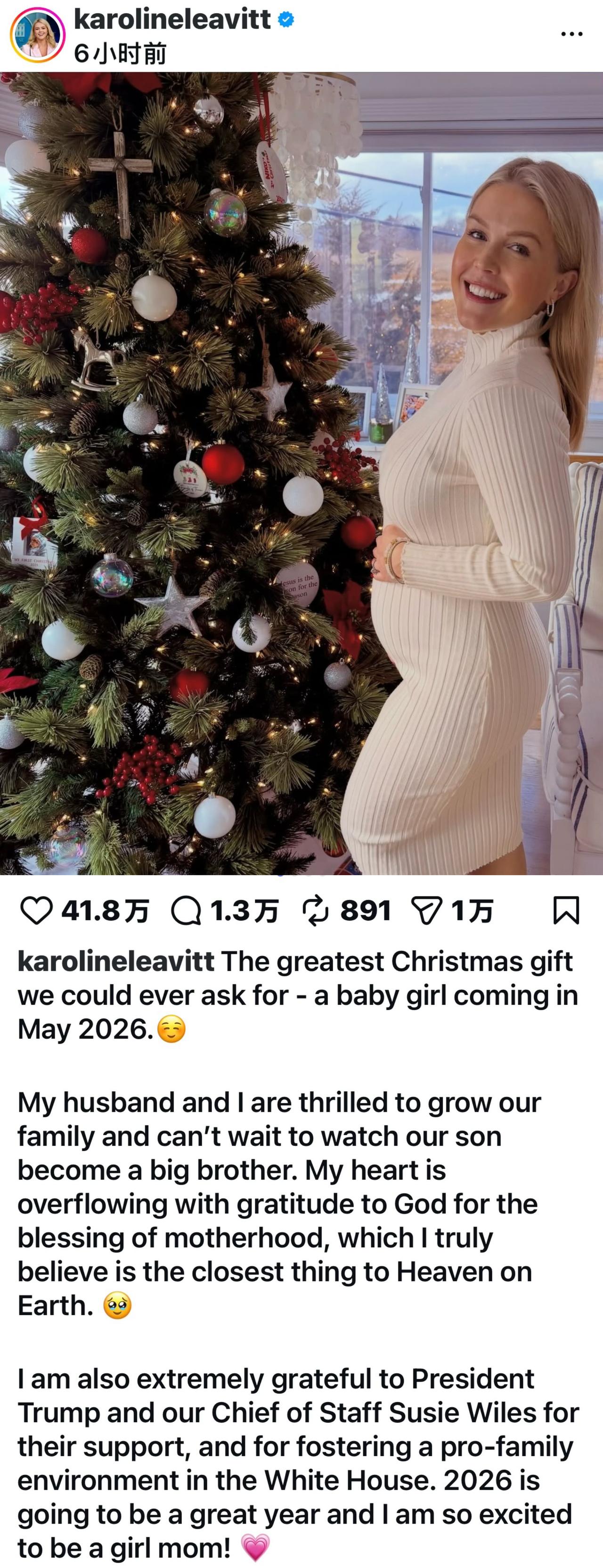 美国白宫新闻秘书卡罗琳·莱维特周五宣布她怀上了第二个孩子。 “我们能收到的最好的圣诞礼物就是——一个女宝宝将于2026年5月出生,”莱维特在Instagram上发帖写道。 “我和丈夫很高兴我们的家庭成长,迫不及待地想看到我们的儿子成为大哥。 我的心充满了对母亲的祝福的感激之情,我真的相信这是最接近人间天堂的事情,”她写道。 “我也非常感谢特朗普总统和我们的幕僚长苏西·怀尔斯的支持,以及在白宫营造的亲家庭环境。2026年将是美好的一年,我很高兴能成为一名女孩妈妈!” 莱维特Leavitt今年28岁,是最年轻的白宫新闻秘书,她曾在唐纳德·特朗普总统的第一个任期内在新闻办公室工作,还担任他2024年竞选的新闻秘书。 2022年,莱维特Leavitt在她的家乡新罕布什尔州竞选国会失败。 她和她的丈夫Nicholas Riccio在2024年迎来了他们的第一个孩子Nicholas "Niko" Robert Riccio。