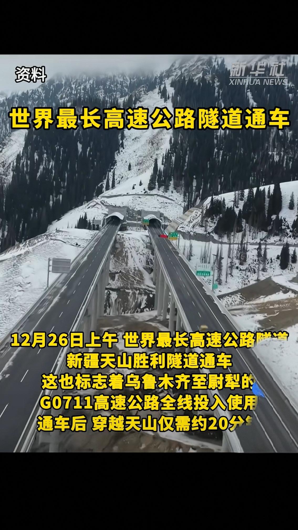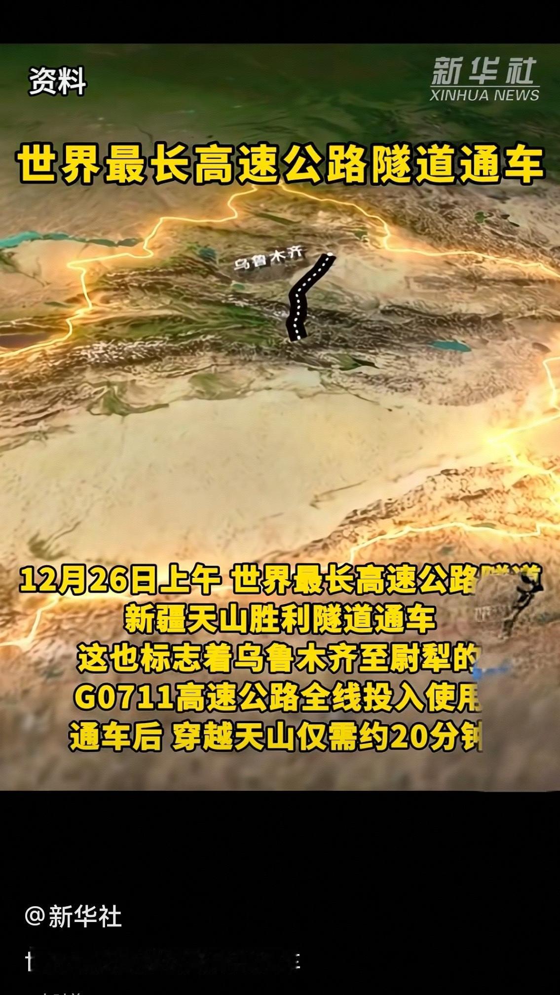 20分钟穿天山!世界最长隧道通车,这背后藏着中国人的浪漫与硬核 12月26日上午,新疆天山胜利隧道正式通车,G0711乌鲁木齐至尉犁高速公路全线启用。从此,穿越天山的时间从过去的3小时锐减至20分钟,这座横亘南北疆千年的天然屏障,终于被中国人用智慧与汗水打通。 谁能想到,这条22.13公里的隧道,相当于5座南京长江大桥首尾相连,要在海拔近3000米的高寒缺氧环境中掘进,还要闯过16处地质断裂带——就像在“豆腐脑里雕花”。穿越F6断裂带时,36天的涌水量堪比30个标准游泳池,掘进速度从每天35米骤降至3-5米;极寒天气里,地表冻土厚达数十米,施工设备都要裹上“保暖衣”才能运转。 但中国建设者总有破局的妙招。他们首创“三洞+四竖井”工艺,在天山腹地挖出三条平行隧道,再用四条707米深(相当于236层楼)的竖井保障通风,把超长隧道“切分成”15段同步施工,硬是将10年工期压缩至52个月。两台自主研发的“吞石巨兽”TBM掘进机,刀盘直径达8.43米(接近3层楼),以比传统钻爆法快5倍的速度双向奔赴,精准对接时误差不超毫米。 更暖心的是,工程师们早考虑到长隧道驾驶疲劳,特意在洞内打造了三处新疆特色景观带,蓝天、草原、胡杨、雪峰轮番映入眼帘,20分钟车程变成了沉浸式风光之旅。对牧民巴太来说,这条隧道更是“致富路”,从给勘测队当向导到成为项目部驾驶员,一年10万元收入让他计划把牧家乐改成民宿;对南北疆百姓而言,乌鲁木齐到库尔勒的车程从7小时缩至3.5小时,早餐吃抓饭、午餐游孔雀河的一日跨疆游成为现实。 这条隧道打通的不只是地理阻隔,更是南北疆的资源通道、文化纽带。北疆的能源装备能更快运往南疆,南疆的新鲜瓜果、牛羊肉能直达北疆餐桌,人才、物资、文化的双向流动从此畅通无阻。当车轮碾过平整路面,我们看到的不仅是世界最长隧道的工程奇迹,更是中国人“不破楼兰终不还”的坚守,是“基建狂魔”背后对民生的温柔关照。乌尉高速隧道