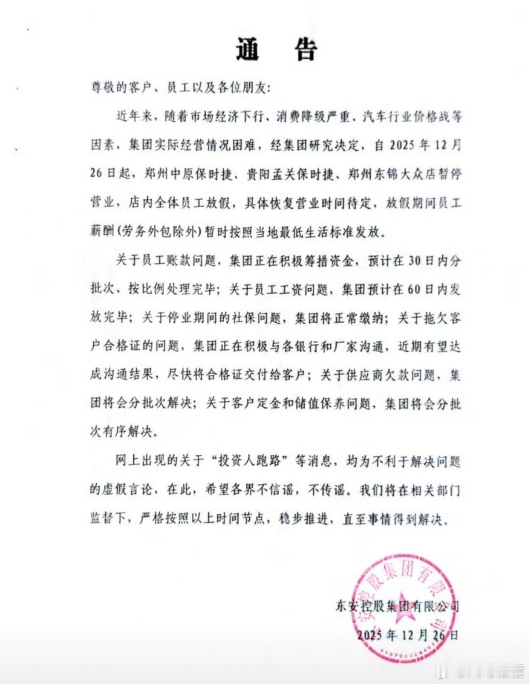最近郑州中原保时捷中心等几家店被曝人去楼空,大家都传是店家跑路了昨天,这些店的母公司东安控股发了通告,说不是跑路,是市场不好、价格战太猛导致经营困难,还宣布郑州中原保时捷、贵阳孟关保时捷、郑州东锦大众这三家店从当天起暂停营业。通告里还说,员工的账款30天内分批给,工资60天内结清,客户的合格证、定金这些事儿,会在相关部门监督下慢慢解决让我意想不到的是保时捷这样顶级的豪华品牌居然能和跑路这样字眼联系到一起,这下是不是打破了大家对豪华车4S店躺着都能赚钱的固有印象