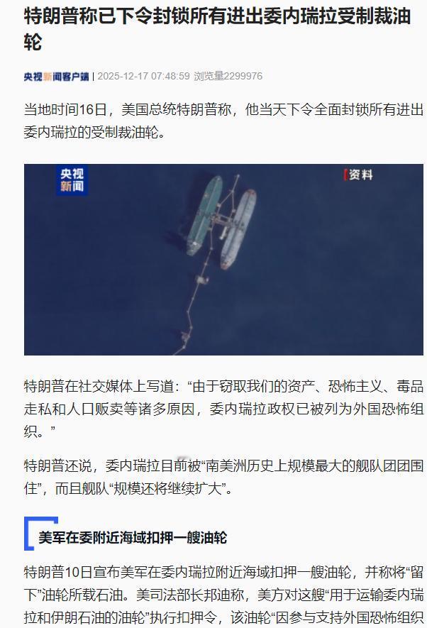 特朗普正式宣布:被扣押的中国香港“世纪号”油轮所载180万桶委内瑞拉原油,以及船舶本身,将由美国“永久保留”。上面装有200万桶石油,2个月时间美国已扣押2艘中国船只。 明眼人都清楚,这根本不是什么“执法”,就是赤裸裸的抢劫,把国际法和道义当空气踩。 两次扣船中间,特朗普还高调下令全面封锁进出委内瑞拉的受制裁油轮,甚至给委内瑞拉现政府扣上“外国恐怖组织”的帽子,这套操作明显是早有预谋。 “世纪号”挂着巴拿马国旗,船东是香港公司,一直安安分分做能源运输,之前也多次从委内瑞拉给国内炼油厂运油。 这次刚装满油驶出委内瑞拉专属经济区,美国海岸警卫队就派直升机让特工强登扣船。 更可笑的是,美国官员后来自己承认,扣船时连正规扣押令都没有,“世纪号”也不在任何国际制裁名单上,只能拿“核实巴拿马注册信息”当借口,根本站不住脚。 半个月前被扣的还有艘“船长号”,美国以“曾运过受制裁伊朗原油”为由,逼船员把船开到了美国港口。 不管有没有借口,这俩事本质都是美国靠军事力量在国际海域抢东西。美国为啥盯着委内瑞拉原油和中国船只? 说白了就是抢资源、争霸权,还想打压中国。委内瑞拉是全球石油储量最多的国家,美国早就馋这块肥肉了,又看不惯坚决反霸权的马杜罗政府,总想推翻他扶持傀儡,把石油攥在自己手里。 扣中国的船还有更深的坏心思:现在中委能源合作越来越近,委内瑞拉卖给中国的石油,八成多是“石油换贷款”,六成以上用人民币结算。 这直接戳中了美国的痛处,全球石油贸易长期用美元结算,这是美元霸权的核心支柱。 美国扣“世纪号”,就是想破坏中委合作,断人民币国际化的路,遏制中国在拉美的影响力,还想试探中国底线看咱们退不退。 美国的霸道还不止这些,扣“世纪号”的同时,还在大西洋追另一艘要去委内瑞拉装油的“贝拉1号”,把人家逼得在公海疯狂逃窜,发了75次求救信号。 为了封锁委内瑞拉,美国派了航母、战机和20多艘军舰,摆了15000多名军人,借口是“扫毒”,却拿不出任何证据。 联合国都承认委内瑞拉不是主要贩毒国,这借口纯属掩人耳目。这种行为已经惹了众怒,委内瑞拉谴责是“盗窃”,巴西、阿根廷等多国都支持委内瑞拉,反对美国霸凌。 有人觉得这事在加勒比海,和咱们没关系?其实不然。“世纪号”是香港的船,船上的油本来要满足国内能源需求,美国扣船抢油,直接损害中国企业利益。 长远来看,美国这种“想抢就抢”的霸权逻辑不被遏制,中国企业海外做生意的风险会越来越大,合法贸易凭啥要被美国干涉? 中国政府态度很明确:美国这行为严重违反国际法,中方坚决反对,支持委内瑞拉维权。这些年面对美国施压,咱们从没退缩过,因为妥协只会让它得寸进尺。 现在美国已经很孤立了,国内很多人反对出兵委内瑞拉,国际上绝大多数国家都不认可它的非法行为,再动武只会陷入战争泥潭。 说到底,特朗普政府扣船封锁委内瑞拉,就是为了维护霸权、抢资源、打压新兴国家。这种逆历史潮流的事注定成不了。 咱们老百姓要认清美国霸权的真面目,明白反对霸权、维护自身利益的重要性。 霸权就像强盗,越退越嚣张,只有各国联合抵制,国际秩序才能回归正轨。美国这次的强盗行为,只会让更多国家看清它的真面目,加速霸权衰落,这是历史必然。