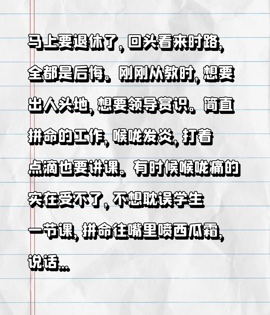 马上要退休了,回头看来时路,全都是后悔。 刚刚从教时,想要出人头地,想要领导赏识。 简直拼命的工作,喉咙发炎,打着点滴也要讲课。有时候喉咙痛的实在受不了,不想耽误学生一节课,拼命往嘴里喷西瓜霜,说话就像吞刀子,照样讲课。 有了孩子后,刚好有资格参评职称了。根本顾不上陪孩子,陪家人,一天到晚做课题,写论文,收集各种资料。 妻子埋怨不理解,儿子到现在都和我不亲,拼职称拼出了一生的遗憾。 再后来因为教学成绩出色,开始当九年级班主任,教毕业班。 那时候更忙了,因为当时周末九年级学生不离校,继续补习。 一心扑在升学率上,比校长还要在意。儿子参加中考我都没有时间陪考,平时更没有时间辅导他。 儿子中考成绩不理想,娘俩几个月没有搭理我。 后来又开始评副高职称,又一轮的竞争各种荣誉证书。周末很少陪家人,我爸生病住院都是媳妇在照顾。 现在想想,拼了一生,虽然是副高职称,但工资不过6000多块钱。 而我落了一身病,儿子和我感情不亲,又亏欠了父母和妻子。 是取得了不错的升学率,但这只是帮助校长高升了,谁会记得我的付出? 如果来生我还是一名教师,我一定把工作只当成工作,不再把它当成全部。 我要好好锻炼身体,好好参与孩子的成长,好好陪伴家人。周末快乐的休息,讲课累了就让学生做一会练习。 我不会再为了虚幻的职称和荣誉,把什么都弄丢了,又累垮了自己。