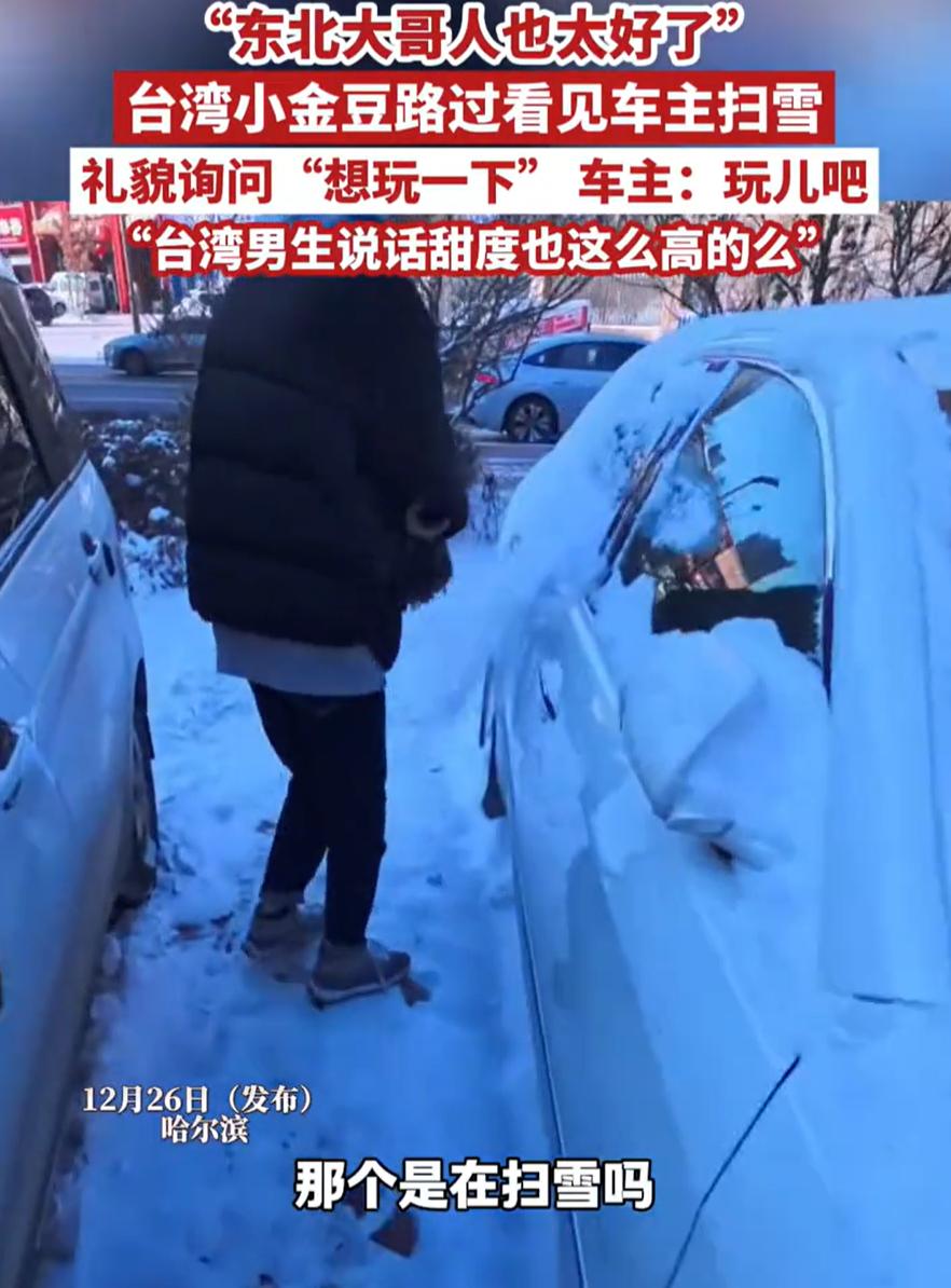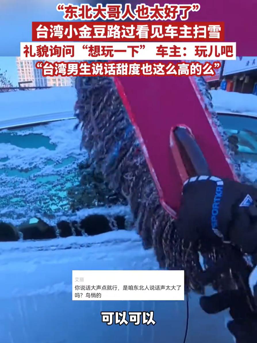 笑不活了!黑龙江哈尔滨,一男在早上在路边擦车扫雪,本来干的不开心,结果突然一名男生走过来,礼貌询问自己能不能“玩一下”,一句话直接把男子都给弄懵了,后来才知道,对方是台湾过来的,没见过这种扫雪,觉得很有趣。网友:扫雪来我家院子玩,给你一把扫帚 视频中,大哥正拿着拖布,闷头给自己车上除雪。天冷得刺骨,他动作有点僵,脸上也挂着没睡醒的懵。这活儿累人,还冻手,任谁干着都难说有多开心 正忙着,一个年轻男生凑了过来,眼神亮晶晶的,挺有礼貌地问:大哥,这是在扫雪吗?能借我玩玩吗? 大哥当时就愣住了。他可能这辈子都没听过这种要求,这冰天雪地的累活,还有人主动要“玩”?他愣了几秒,也没多话,直接把拖布递过去:玩儿吧 男生接过工具,还挺认真地问:这个该怎么用啊?在大哥简单的指导下,他就开始有模有样地扫起雪来。一边扫,一边忍不住发出“哇”、“好好玩”的感叹,新鲜得像个拿到新玩具的孩子。这场面把一旁的大哥都看乐了,也看懵了。聊了两句才知道,这男生是从台湾来的 看到这一幕,不少网友也是纷纷调侃起来 有网友说:大哥当时内心想的应该是:我这冻的Der喝的,他还愿意玩 还有网友说:哈尔滨头几天大雪,我下班在雪里挖了二十分钟全车都是冰还有雪,累出来一身汗,咋就没有碰上南方的小朋友呢 这件事本身很小,却很有意思,其实南北之间,大陆与台湾之间,类似的“温度差”和“新鲜感”一直存在。南方人见到大雪的兴奋,北方人听到闽南语歌曲的好奇;这边巷子的煎饼果子,那边夜市的蚵仔煎,都可能成为彼此眼中有趣又生动的风景 我觉得这件事也提醒我们,生活里很多看似平常的小事,其实在别人眼里可能是新鲜和有趣的。对当地人来说,这只是日常,但对游客或外地人来说,却可能是一段独特的体验