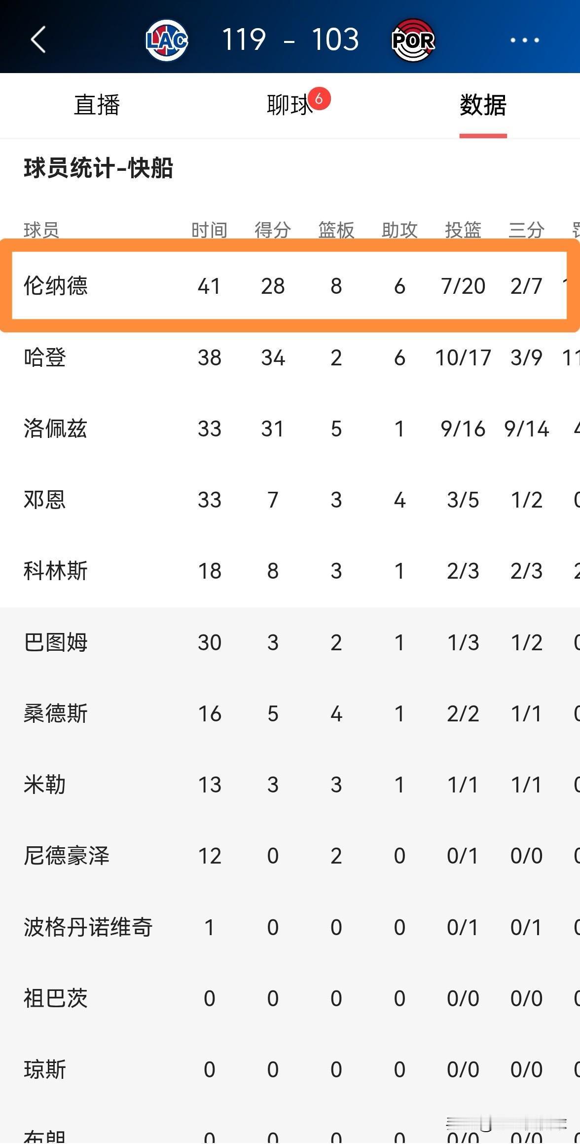 快船当家球星伦纳德真是太反常了!虽然今天快船在客场以119:103大胜开拓者喜迎三连胜,但是伦纳德却一反常态打得非常低效。 全场比赛下来,伦纳德首发出战41分钟,投篮20中7,其中三分球7中2、罚球12中12得到28分8篮板6助攻3抢断1盖帽,他的场上正负值为+17。 对于向来以稳定高效著称的伦纳德来说,本场比赛他在进攻端的表现着实太反常了。
