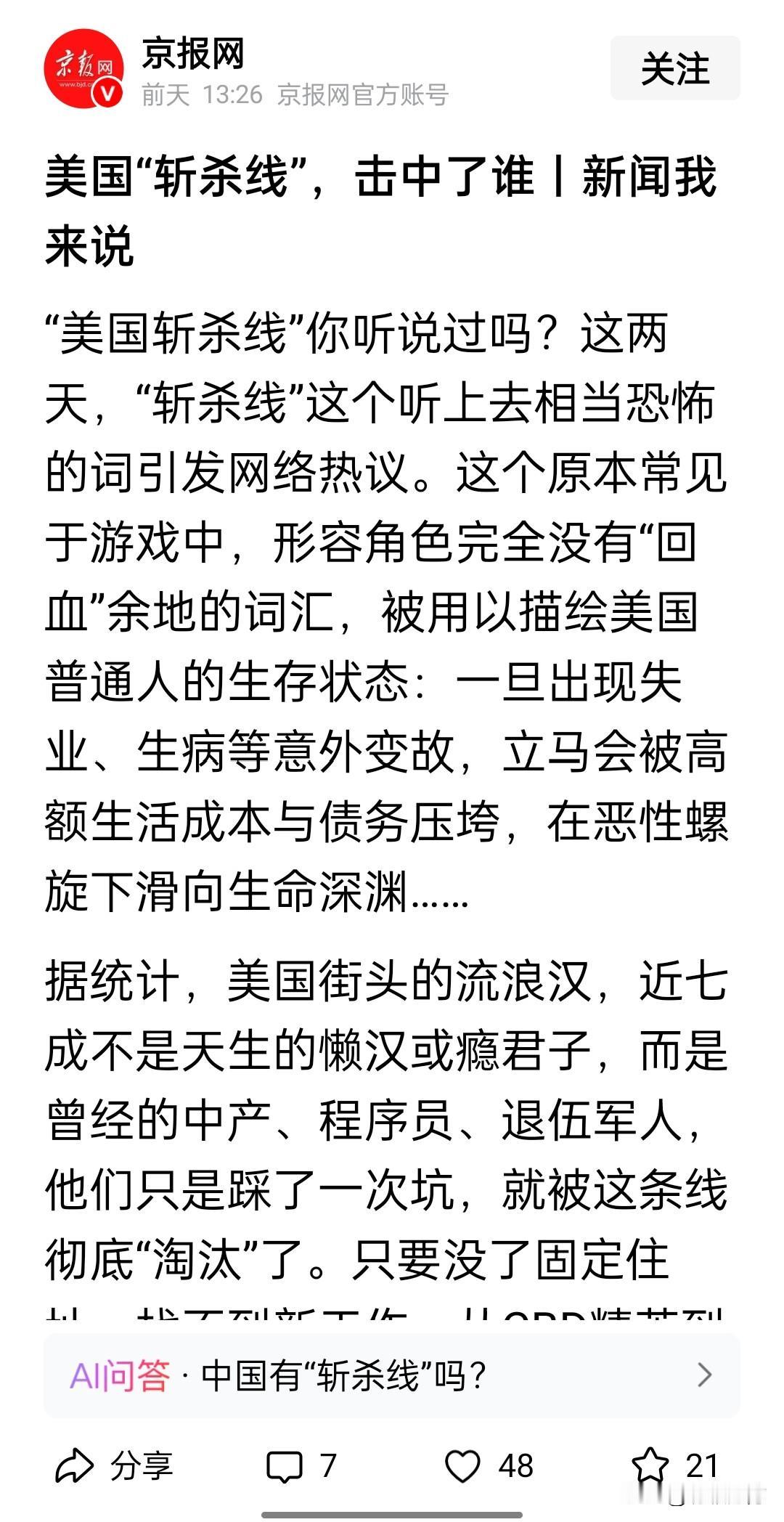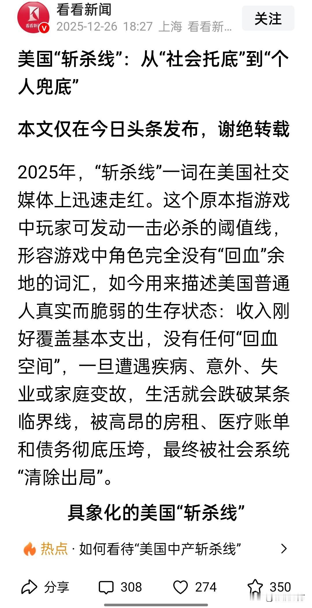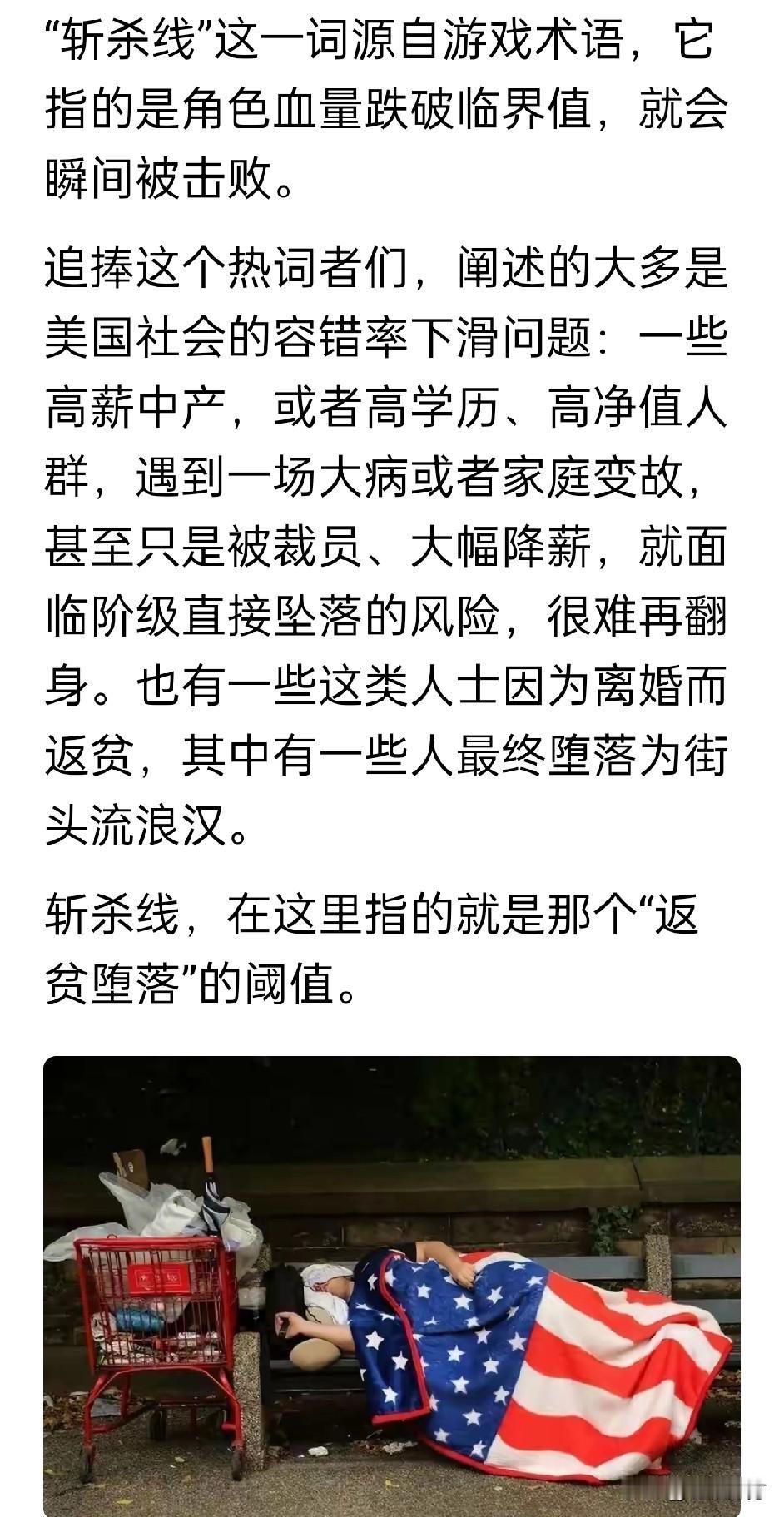 最近一个新创的词语“美国斩杀线”在网络热传,什么意思呢?就是说美国的许多普通人刚好能达到收支平衡,稍有意外就会入不敷出,一路盘旋而下,再无“回血”的可能。 这个词揭露了美国血淋淋的残酷现实,虽然美国经济总量全球第一,到处插手刷存在感,但居民的幸福感与安全感与他们的经济体量并不相配。由此可见强调GDP总量太过片面,人均收入也总是掩盖贫富差距,国家富裕程度应该看国民收入的中位数,更应该看一国居民在遭受意外后正当、体面回血的可能性。“美国斩杀线”的出现,可以说击破了美国华丽的外衣,将其冷酷、紧迫的民众生存状况展示在世人面前。美国斩杀线