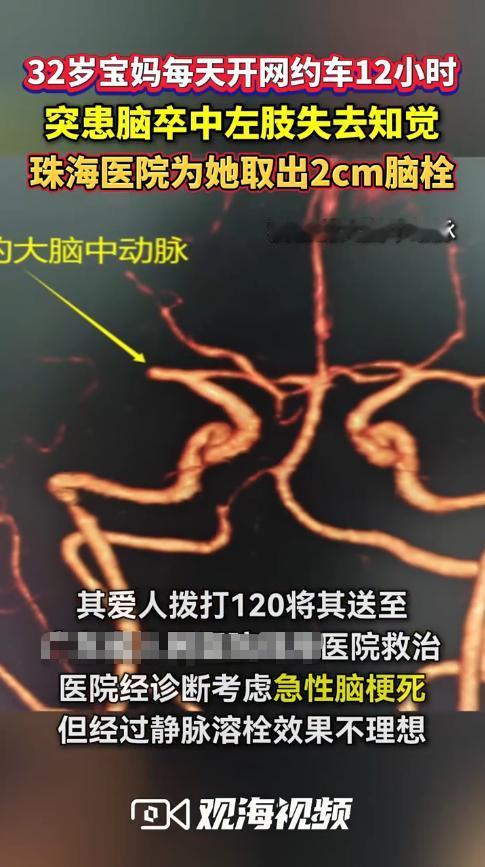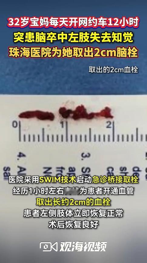 “悲剧还是发生了!”近日,广东珠海,一女子为了多赚些钱,每天都在努力跑网约车,这天,她连续工作了12个小时才回家休息,可是上厕所时。左侧身体却突然没了知觉,送往医院后被诊断为“中风”!网友:果然穷才是最可怕的。 现在市民们出行,都喜欢叫网约车,不仅能够提前预约,安全方面还有保障,最关键的是价格透明,但是随着网约车软件越来越多,网约车司机的压力就变大了,很多人为了多赚些钱,只能连轴转。 据媒体12月11日的报道,李女士是一名年轻的宝妈,她为了让孩子上更好地学校、用最好的东西,总是拼了命的工作,常常一天工作十多个小时。 可是人的身体是有极限的,如果一直得不到休息,早晚是会垮掉的! 果不其然,这天,李女士结束工作后回家休息,结果却在厕所里摔倒了,丈夫听到动静后急忙赶来查看,发现妻子左边的身体无法正常移动,于是立即将她送去医院治疗。 医生检查后发现,许女士大脑中的一段血管被堵死了,这才导致她的身体不听使唤,医生急忙安排了手术,顺利取出了一段2厘米长的血栓! 身体是革命的本钱,大家再忙再累,一定要注意休息、按时吃饭,如果连身体都垮掉了,那么挣再多的钱也没有意义。 信息来源:《医护开通血管取出2厘米血栓,32岁妈妈连跑12小时网约车后中风》海报新闻