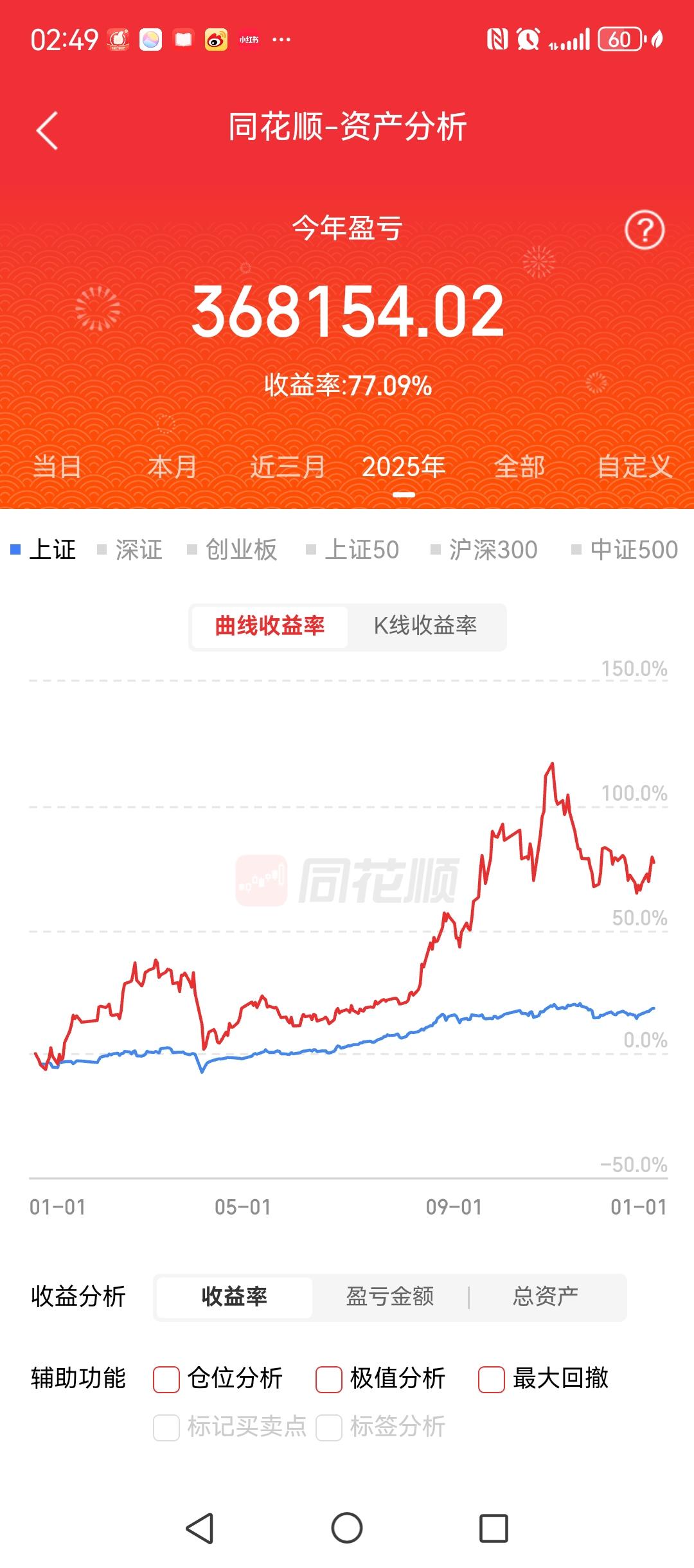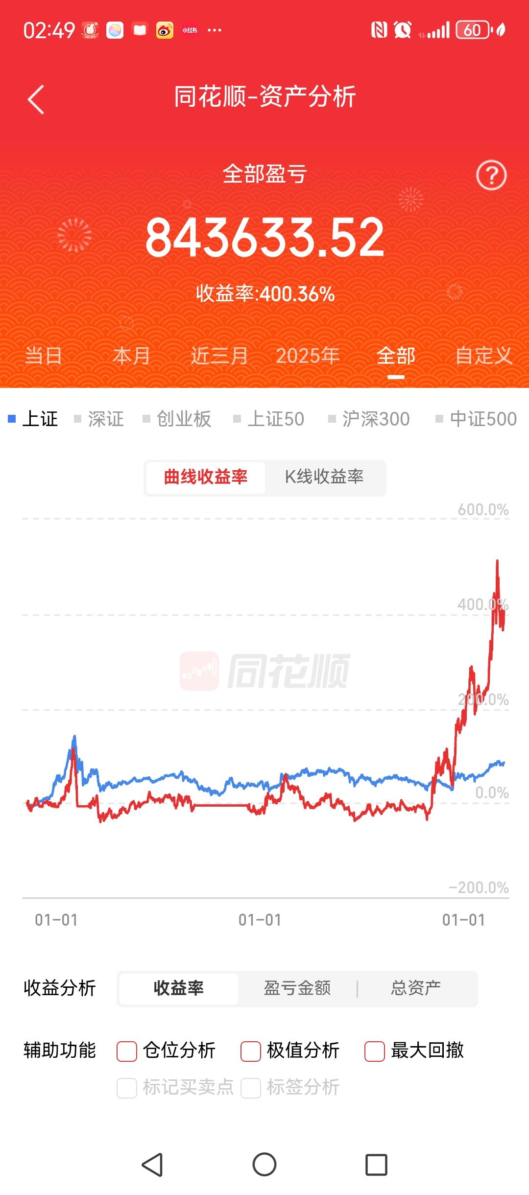 这个账户,2021年至今,累计收益接近500%,目前显示收益是略超400%。 2021年3月12号,我们重仓买入了沃尔核材,成本在6块8附近。2021年到2024年2月6号,市场不好,该股来回震荡。但我们坚定持股,直到2024年10月23号卖掉。 2024年11月份我们买入生益科技和另外一个股票,各半仓。2024年1月22号卖掉生益科技,出来这部分资金买入002273,直到今年10月卖掉,收益在20%左右,不高。后面各自买入的两次半仓,一直持有,直到现在。 从2024年2月6号最低点开始,交易只有2~3次。最高时候,这个账户的收益接近800%。今年一度翻倍,10月份市场调整之后有所回落,现在收益是80%左右。 春节前后,这个账户的收益应该会再次创出新高。敬请期待!