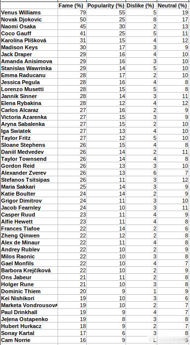 在美国,现役网球选手的出名程度排名如下(根据受欢迎、不喜欢、中立三个维度):1、大威廉姆斯2、德约科维奇3、大坂直美4、高芙5、卡-普利斯科娃6、凯斯7、德雷珀8、阿尼西莫娃9、瓦林卡10、拉杜卡努11、佩古拉12、穆塞蒂13、辛纳14、莱巴金娜15、阿尔卡拉斯16、阿扎伦卡17、萨巴伦卡18、斯瓦泰克19、弗里茨20、斯蒂芬斯郑钦文也上榜,奥斯塔彭科处于垫底(汤森德高居第22)澳网2026