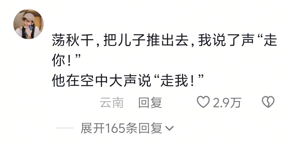 荡秋千,把儿子推出去,我说了声"走你!"他在空中大声说"走我!"
