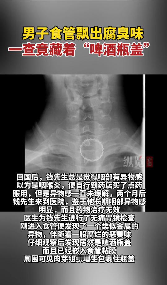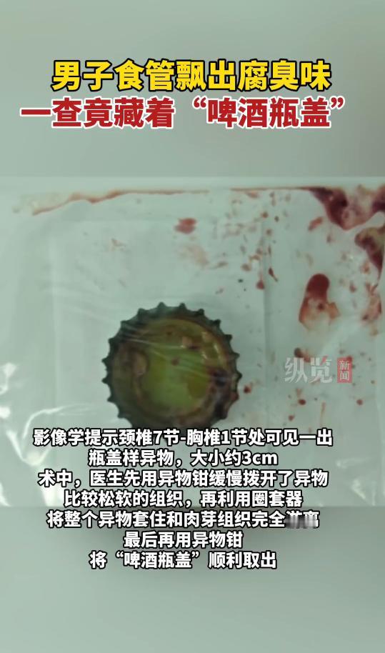“离了个大谱!”近日,浙江杭州,一男子喝酒时,感觉喉咙疼得厉害,急忙跑到厕所呕吐,男子以为是喝得太急导致的,所以没放在心上,可之后2个月时间里,他总是感觉嗓子里有东西,去医院一查,竟是啤酒瓶盖!网友:心怎么这么大。 生活中遇到开心的事,免不了要和朋友庆祝一下,喝酒那是在所难免的,不过喝酒时一定要注意安全,千万别把不干净的东西给咽下去了! 2025年9月,钱先生受公司的委托,前往国外开展业务合作,出发前,同事们为了预祝他顺利,便约了一场饭局。 钱先生在饭桌上喝得非常多,他端起酒杯一饮而尽,丝毫没有注意到里面混进去了其他东西! 酒刚咽下去,钱先生就感觉嗓子不舒服,立即跑到卫生间呕吐起来,之后感觉好多了,就没有放在心上。 从国外回来后,钱先生一直感觉嗓子像是卡了什么东西,特别的难受,不过他并没有第一时间去医院,一直拖了两个多月采取检查。 最终医生在他的食管里发现了个圆形的金属物,仔细分辨后,竟是个酒瓶盖! 手术结束后,钱先生便感觉舒服了很多,没想到自己这么不小心,咽下去一个瓶盖都没发现,幸亏没有出啥大事。 网友看后疑惑,这样子是怎么过得安检,难道机场检查不出来吗? 信息来源:《男子食管取出3cm啤酒瓶盖》点时新闻