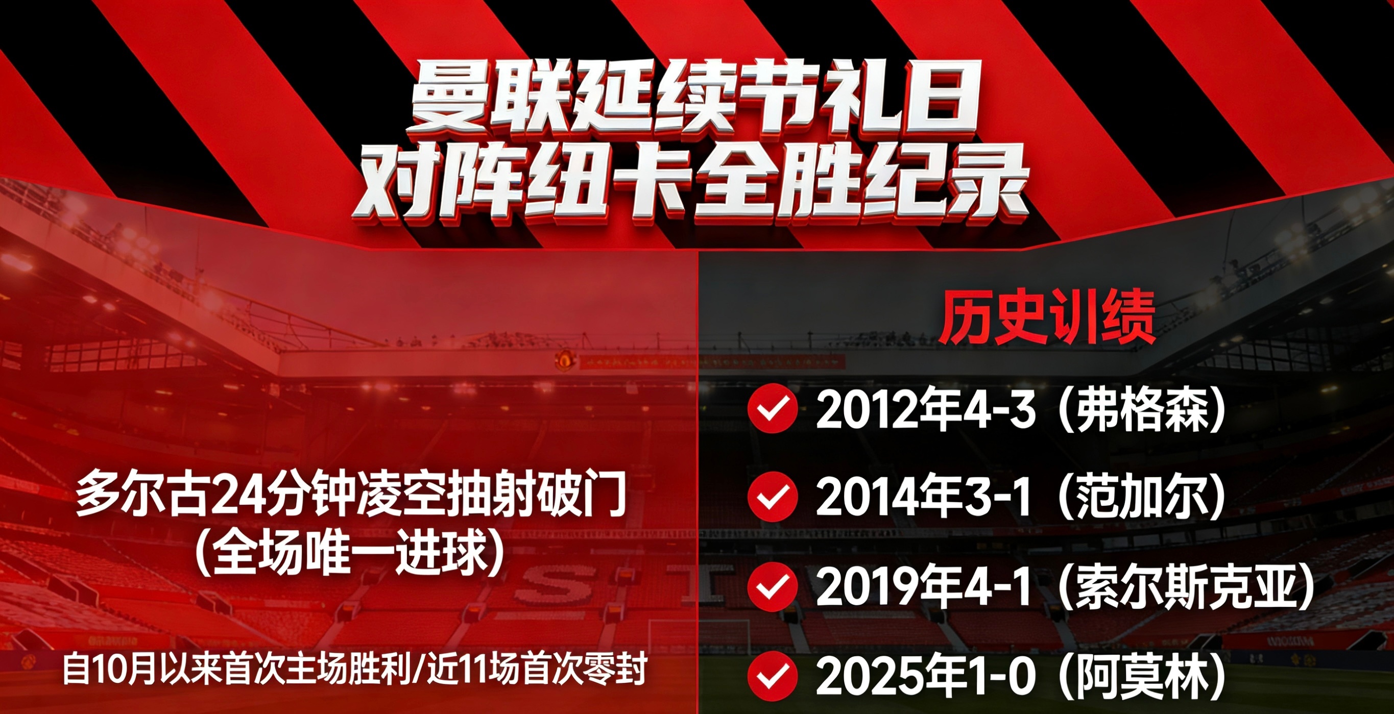 红魔在英超节礼日对阵喜鹊的四场比赛中保持全胜,且每场均由不同主帅执掌。✅ 2012年 4-3(弗格森)✅ 2014年 3-1(范加尔)✅ 2019年 4-1(索尔斯克亚)✅ 2025年 1-0(阿莫林)