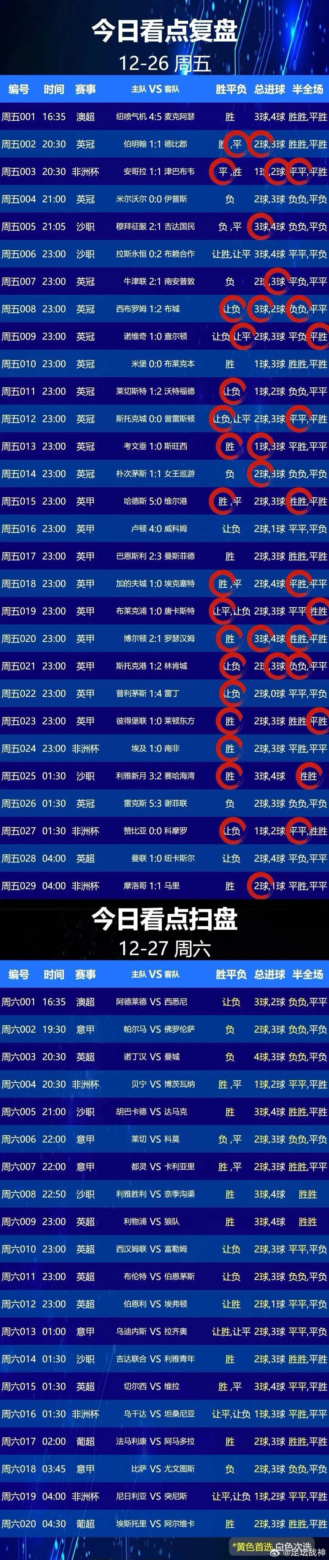 12月27日001 阿德莱德联VS 西悉尼流浪者002 帕尔马 VS 佛罗伦萨003 诺丁汉森林 VS 曼城 004 贝宁 VS 博茨瓦纳