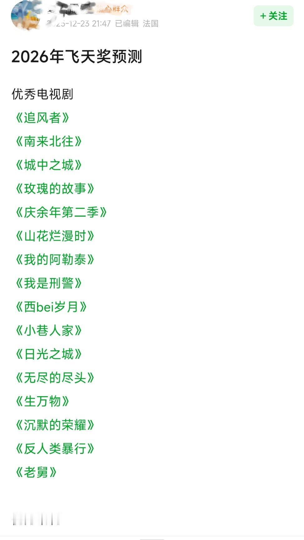 国产剧组开始预测飞天奖了,我觉得基本是从这里面的作品出了。优秀电视剧 《追风者》《南来北往》 《城中之城》 《玫瑰的故事》 《庆余年第二季》 《山花烂漫时》 《我的阿勒泰》 《我是刑警》 《西bei岁月》 《小巷人家》 《日光之城》 《无尽的尽头》 《生万物》 《沉默的荣耀》 《反人类暴行》 《老舅》