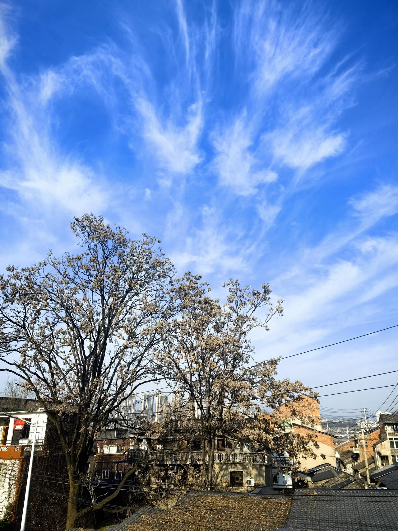 民房 落叶 古树 电线 蓝天……好一幅国泰民安画面!