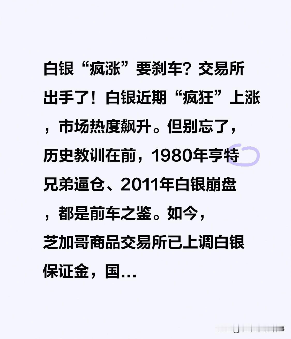 惊爆!白银“疯涨”要叫停?交易所出手了! 近期白银价格“疯涨”,市场热度飙升。要知道,历史教训不少,1980 年亨特兄弟逼仓、2011 年白银崩盘都是例子。如今,芝加哥商品交易所提高白银保证金,国内上期所本月三次风控,像上调保证金等。交易所规则是抑制投机“刹车”,行情或降温!