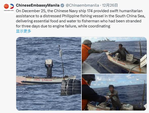 中国驻菲律宾大使馆26日在X平台发文:中国海军在南海救助菲律宾渔民,这清楚的表明中国海军在南海是一只仁义之师,我们将救援所有在南海遇险的不同国家的人,菲律宾抹黑中国在南海正常行动的伎俩不攻自破。菲律宾渔民遇险,结果菲律宾不去救人,中国救了人,菲律宾专家还气急败坏,菲律宾人现在肯定会质疑菲律宾政府之前的宣传以及救援能力。 12 月 25 日,中国海军 174 号舰艇在南海迅速向一艘遇险的菲律宾渔船提供人道主义援助,为因发动机故障而被困三天的渔民送去了必要的食物和水,同时与菲律宾海岸警卫队协调后续支援事宜。有大量菲律宾人在帖子下面点赞转发,结果菲律宾一些专家害怕了,慌忙站出来说要菲律宾人不要盲目相信宣传手段。 菲律宾渔民驾驶的小船因发动机故障滞留海上 3 天 3 夜,食物与淡水耗尽,手持写有 “Help me” 的白色标识求救,该渔民从苏比克出发,因机械故障失联。 中国军舰发现后军舰立即改向靠近,派出救援艇运送瓶装水、压缩饼干等物资;同步与菲律宾海警 4408 号舰沟通协调,通报情况并移交后续处置。 中国驻菲律宾大使馆于 12 月 26 日通过X平台渠道发布消息与现场视频,渔民向中方船员鞠躬致谢,体现人道主义精神。尽管菲律宾不断的在南海挑衅找事,但是我们还是会不分国籍、优先保障渔民的生命安全,符合《联合国海洋法公约》与国际海上搜救惯例,体现中国对南海航行安全与人道主义的重视。 结果这一善良的行为却遭到了菲律宾一些人的过度解读!菲律宾一些专家和倡导者警告公众,不要轻信中国的“宣传”噱头。在事实面前,菲律宾一些人显得很害怕,生怕这么多年在国内宣传的中国‘强势形象’一下子被颠覆了。菲律宾专家说中国的宣传行为要么是为了美化其形象,要么是其策略的转变。 中方以 “生命优先” 的人道主义叙事占据道德高地,与菲方长期塑造的 “中方强硬扩张” 形象相悖,菲律宾部分势力试图通过质疑救援必要性来抹黑这次救援行动。菲方长期向民众宣传 “中国海上力量在南海的强势存在” ,中方救援的正面宣传会引发民众对官方立场的质疑。同时菲律宾也担忧中方宣传暴露菲方海上搜救能力不足,反衬其在渔民遇险时的响应迟缓,进而影响政府与执法部门的公信力。 我们通过救助行动抗可以塑造负责任的大国形象,将压缩菲方在国际社会的舆论空间,使其难以继续以 “受害者” 身份争取同情。