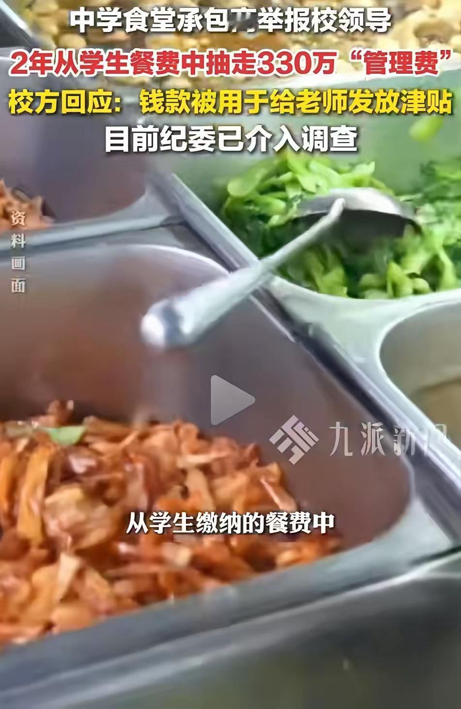 刷到河南周口这中学竟从学生餐费里刮走330万! 食堂老板直接爆料,2022年9月到2024年7月,校后勤负责人逼着收15%返点,硬生生从孩子的饭钱里抽了330多万!校方回应说这钱给老师发津贴,可这话谁信啊? 咱普通人都明白,学校要抽成,承包商还得赚钱,那孩子吃的饭菜能有啥油水?要么分量少,要么食材差,想想都心疼家长的血汗钱、孩子的口粮! 纪委已经介入调查了,这事儿可不能含糊!教育本该是净土,咋能盯着学生的餐费下手?孩子的健康可不是用来换津贴的!这事儿必须查到底,给咱家长和孩子一个实打实的交代才行! 河南中学餐费抽成330万 校园餐费乱象 保护学生饮食权益