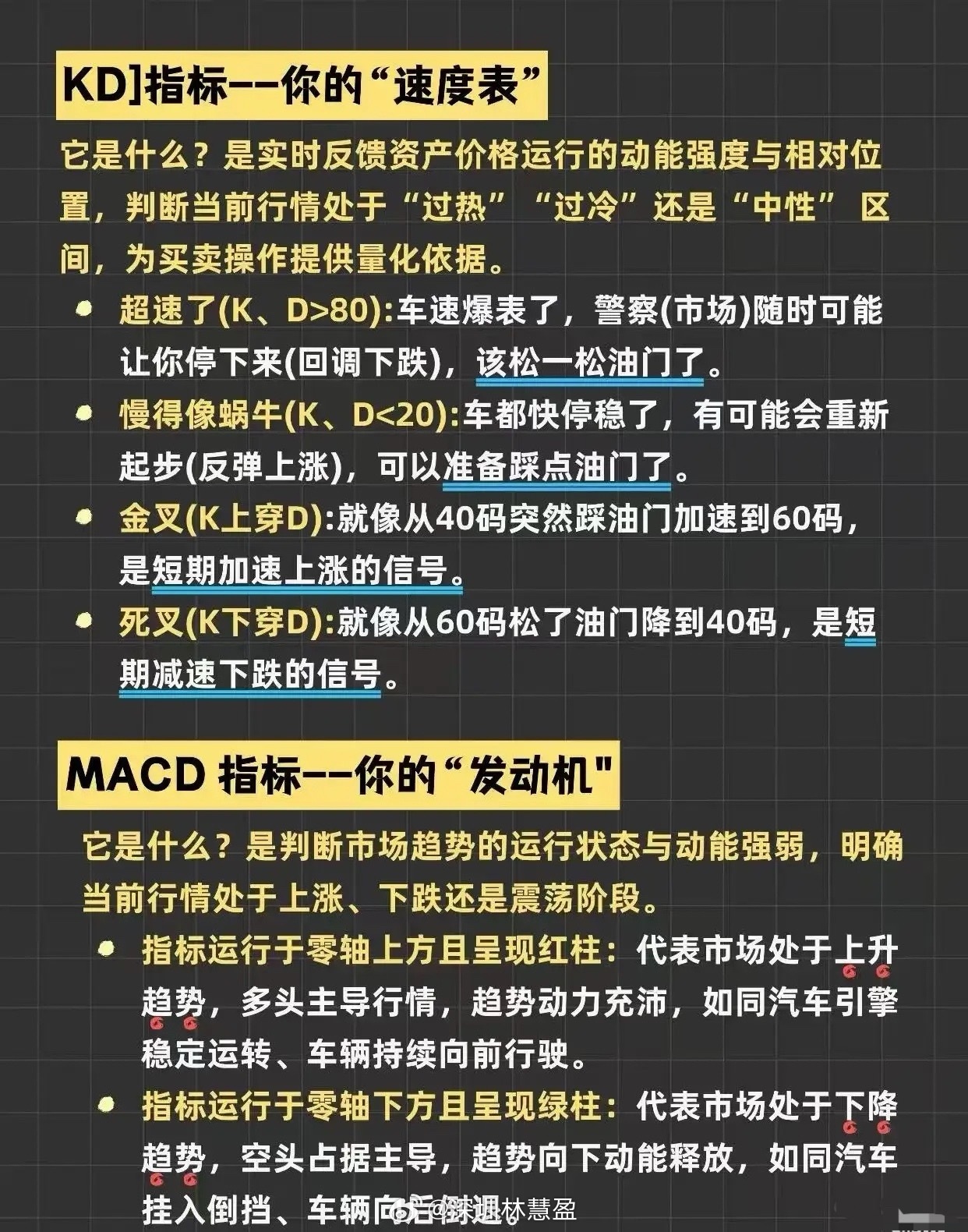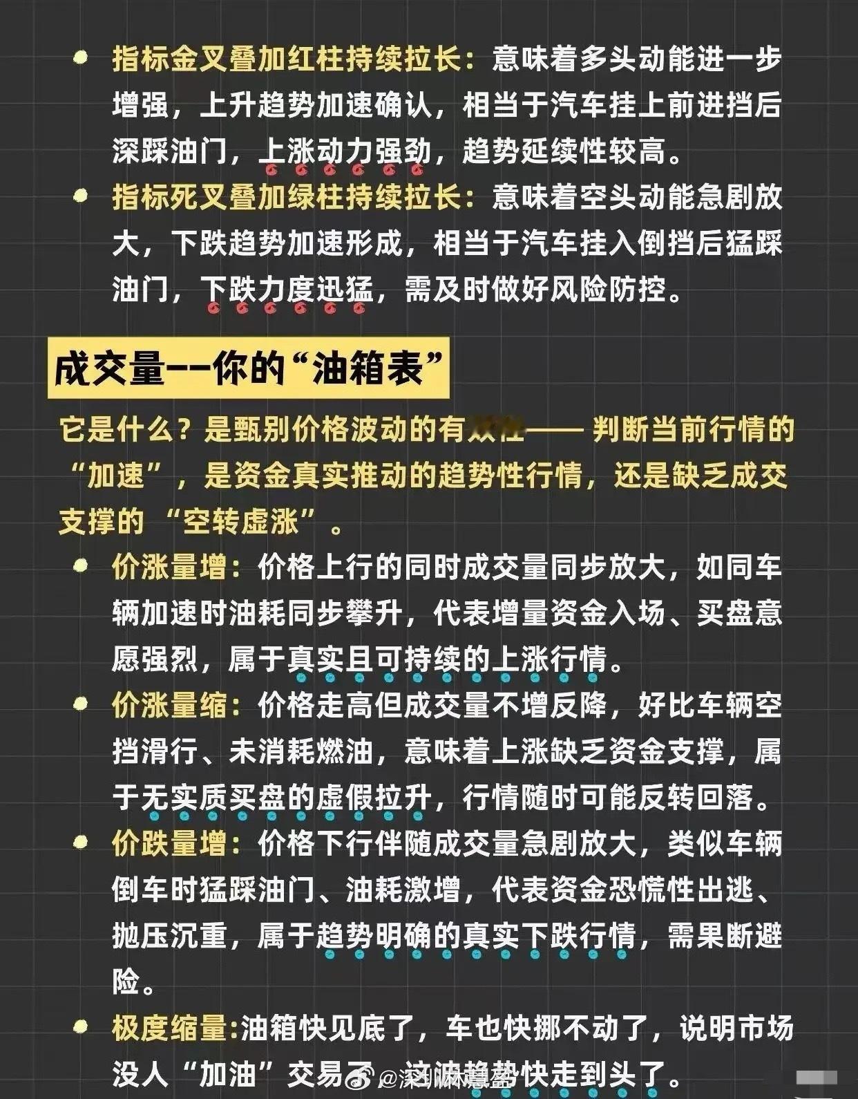 股票投资多个关键“仪表盘”(指标)判断行情,核心内容如下:BOLL(布林带)——车道线:用于判断市场运行空间宽窄及标的价格位置。车道开口(空间拓宽)如驶入高速,交易空间打开、大行情启动概率提升,可择机加仓;车道收口(空间收窄)似至收费站,股价进入震荡收敛阶段,面临方向选择需警惕跟踪;紧贴上轨运行代表强势区间,趋势动能足,持仓者不宜离场;紧贴下轨运行代表弱势区间,趋势支撑弱,需谨慎持股、做好风控。KD指标——速度表:实时反馈资产价格动能强度与相对位置,判断行情“过热”“过冷”或“中性”。K、D值大于80为“超速”,预示回调需松油门;小于20为“慢如蜗牛”,预示反弹可准备加仓;K线上穿D线形成“金叉”,是短期加速上涨信号;K线下穿D线形成“死叉”,是短期减速下跌信号。MACD指标——发动机:判断市场趋势运行状态与动能强弱。指标在零轴上方且呈红柱,代表市场上升趋势、多头主导,如引擎稳定运转;在零轴下方且呈绿柱,代表市场下降趋势、空头主导,如挂倒挡倒车。若指标金叉叠加红柱持续拉长,多头动能增强、上升趋势加速,似挂前进挡深踩油门;死叉叠加绿柱持续拉长,空头动能放大、下跌加速,似挂倒挡猛踩油门,需及时防控风险。成交量——油箱表:甄别价格波动有效性,判断行情是资金推动的真实趋势还是空转虚涨。价涨量增如加速时油耗攀升,是增量资金入场、可持续的真实上涨;价涨量缩如空挡滑行,上涨缺资金支撑,属虚假拉升易反转;价跌量增如倒车猛踩油门,是资金恐慌出逃的真实下跌,需果断避险;极度缩量如油箱见底,市场交易停滞,趋势临近尾声。