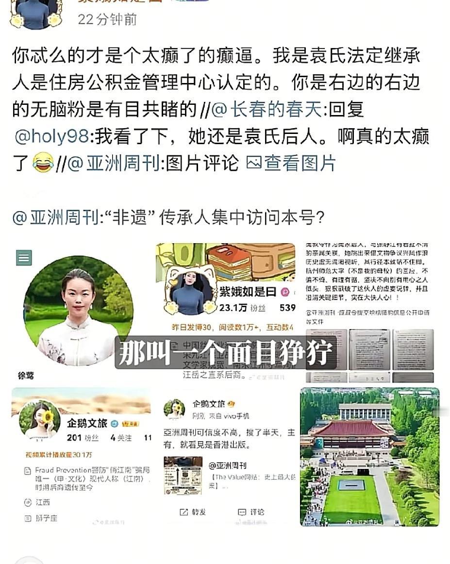 这下好了 全国网友都知道徐莺急眼了 连发百条微博,一一回怼网友的评论,这架势,和她是大学副教授的身份完全相反 接连不断的脏话,书香世家的嘴脸彻底被撕碎,这样的画面就有点像泼妇骂街 最可怜的还是亚洲周刊,成为了攻击的主要对象