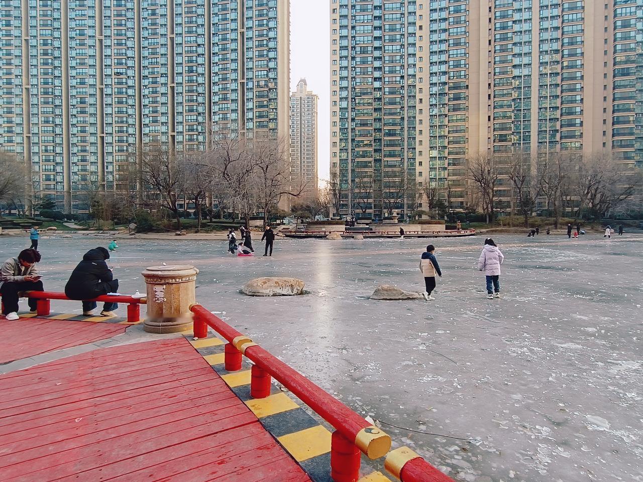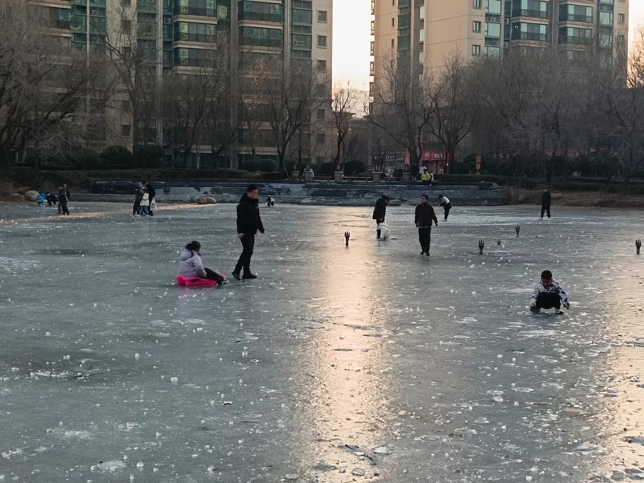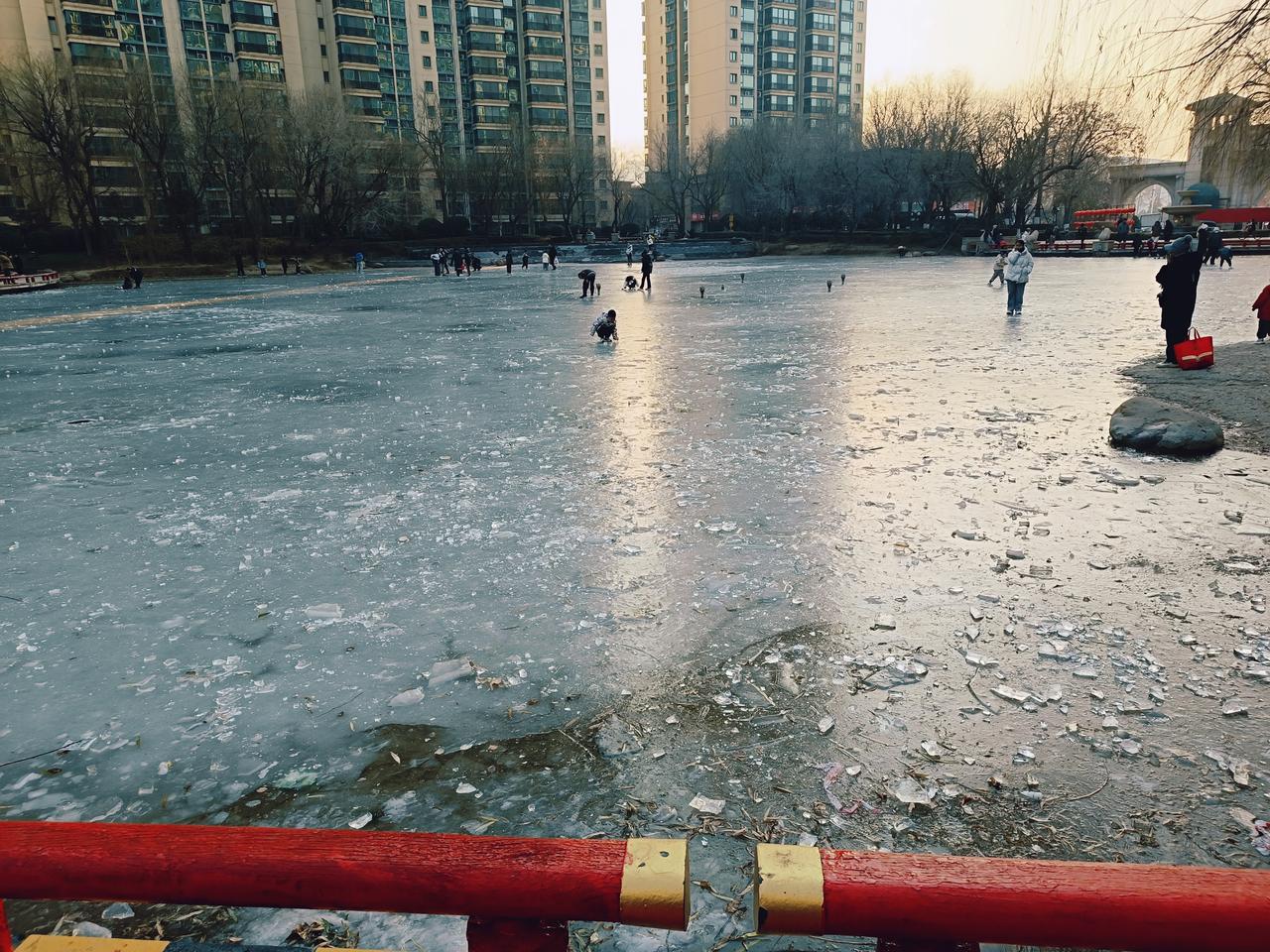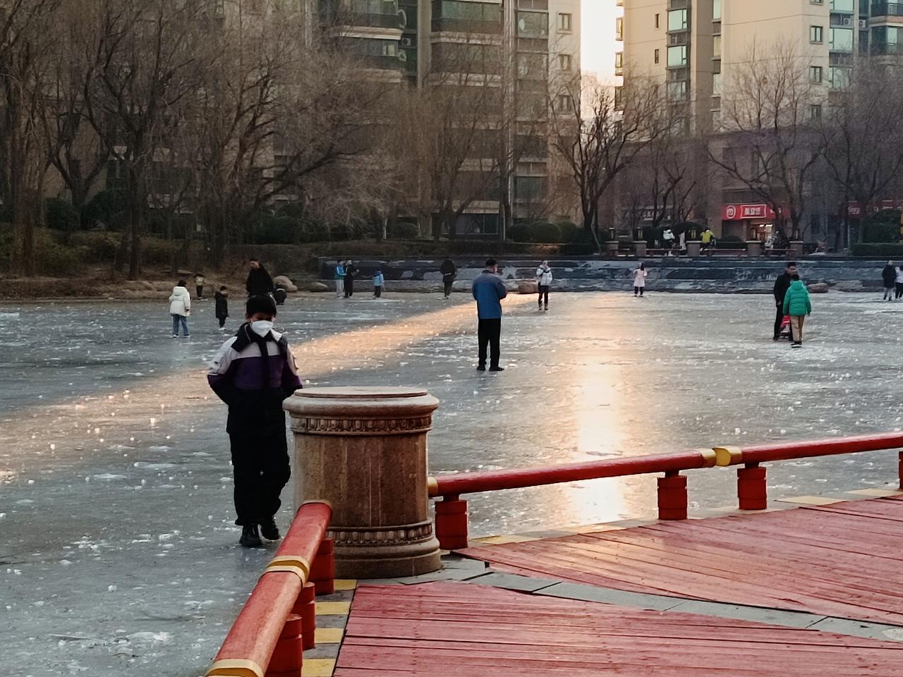 下午四点,我出去透透气,惊喜地看到小区的人工湖冻成天然冰场啦! 此时夕阳刚好,