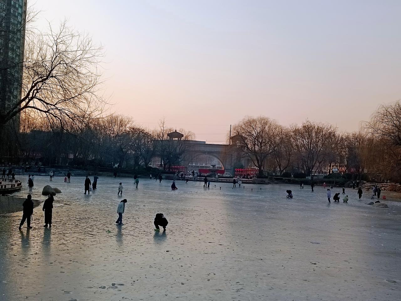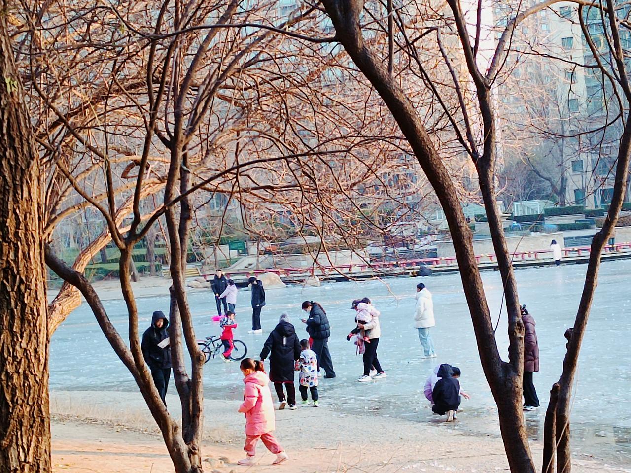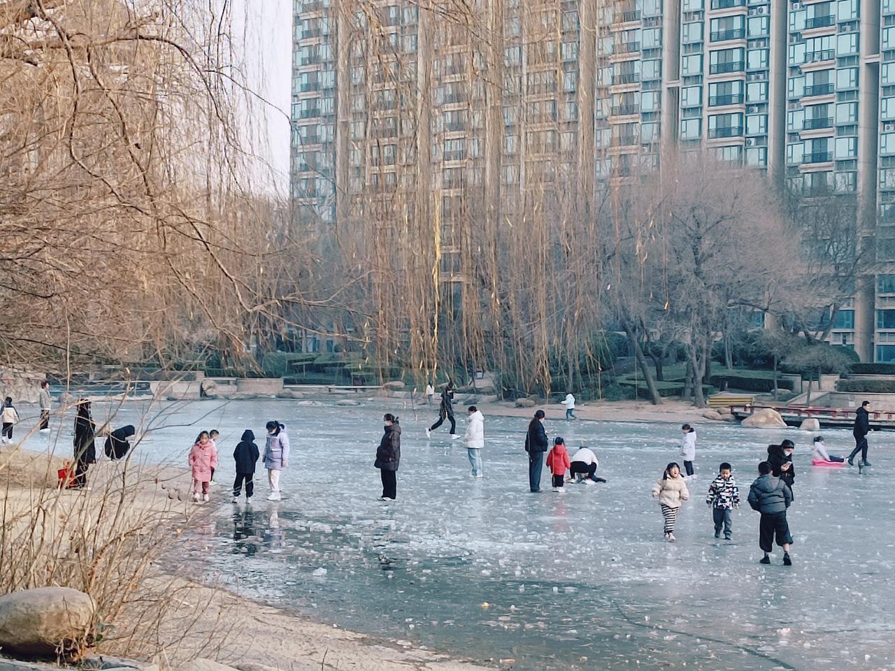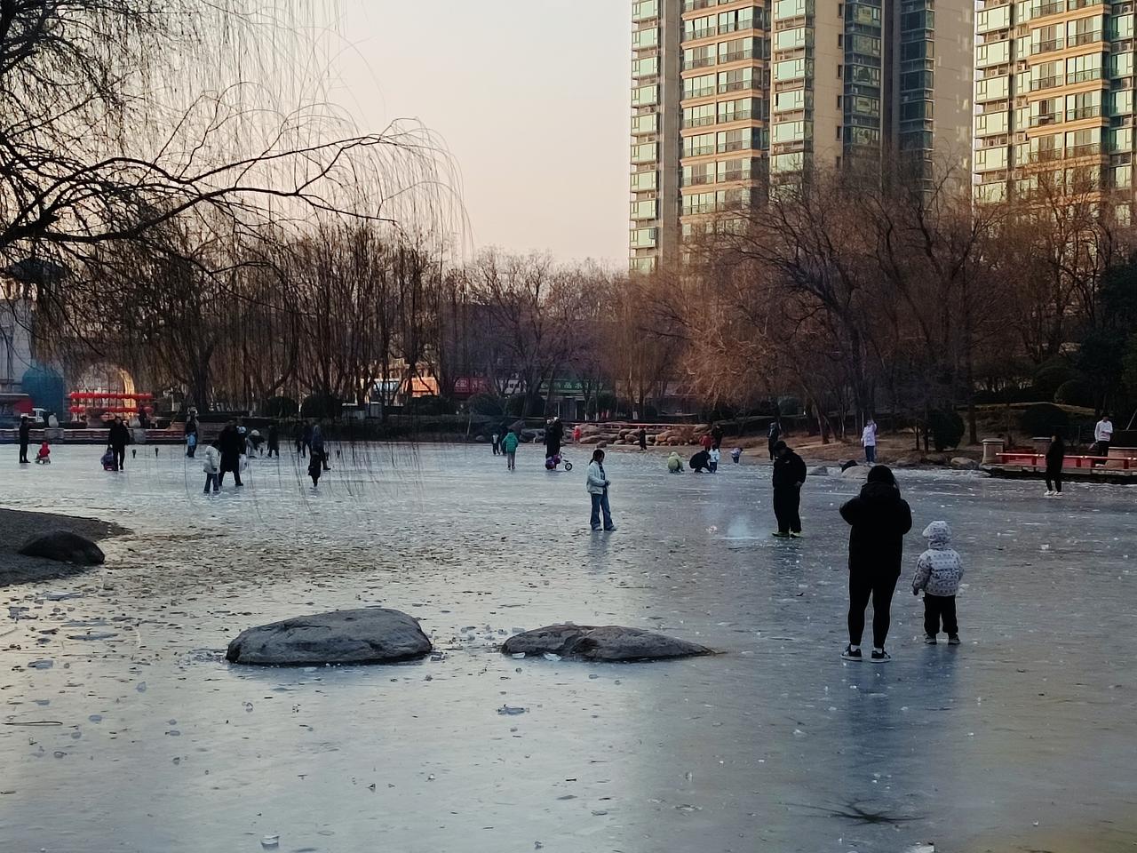 下午四点,我出去透透气,惊喜地看到小区的人工湖冻成天然冰场啦! 此时夕阳刚好,