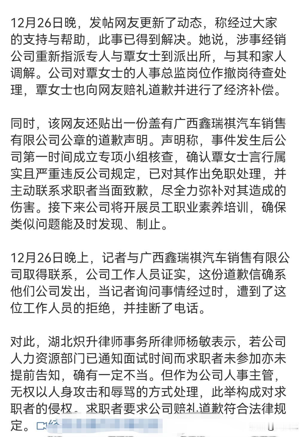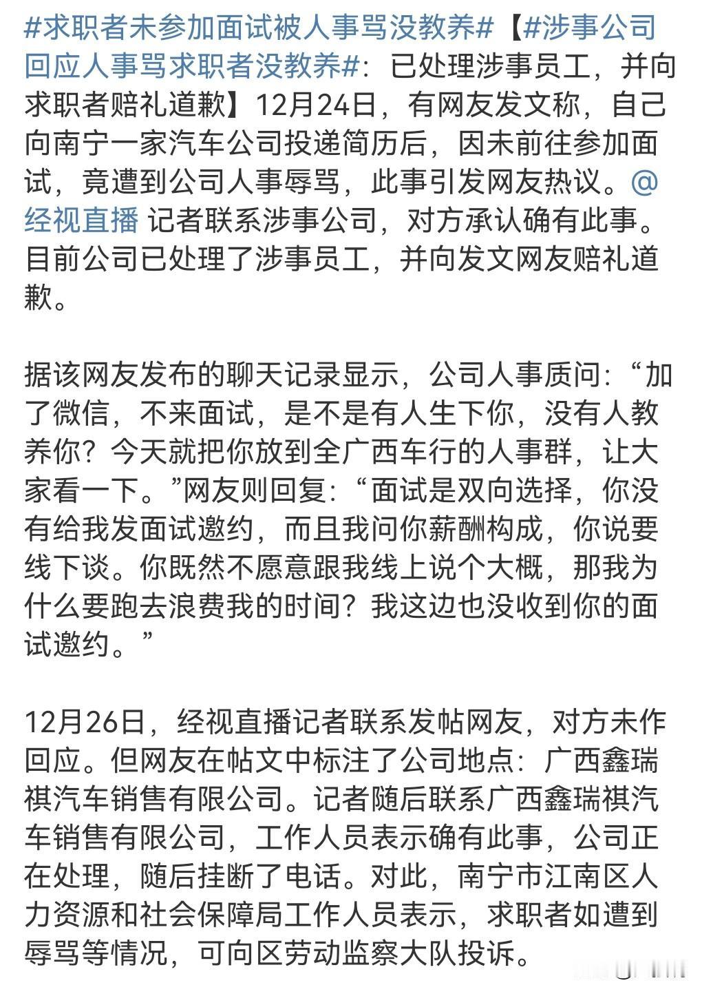 人事和求职者虽然加了微信,但是并没有向求职者提出邀约。 求职者未参加面试被人事骂没教养。 这真的是太恶劣了,人事竟然说求职者有人生没人养。 这样的侮辱性言论简直是丧心病狂啊。 那这个人事还威胁要把求职者挂到网上,让广西车行的人看,人事这种行为,这真的是太恶劣了。 公司已将该人事撤岗。
