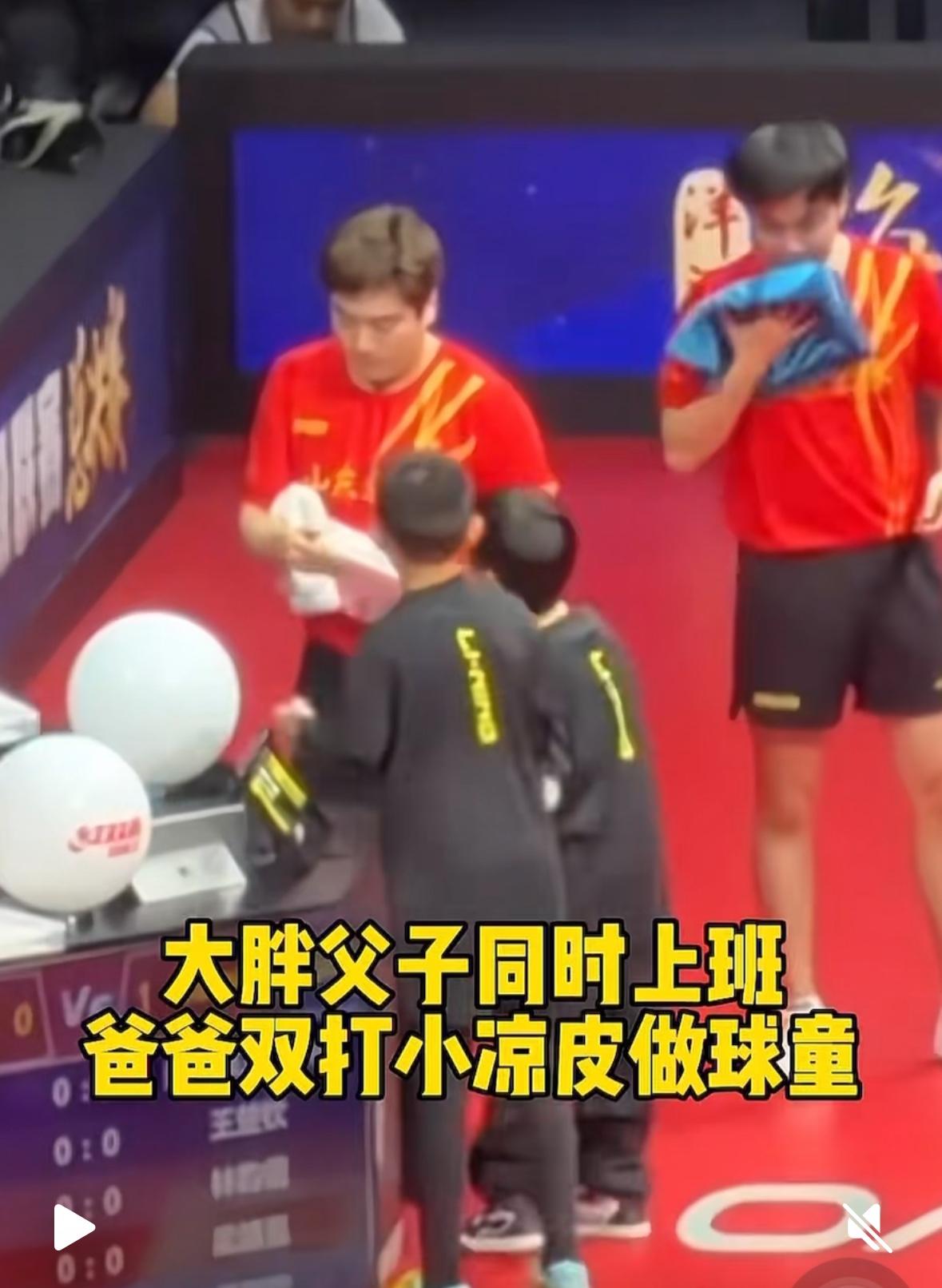 梁靖崑带着儿子凉皮一起上赛场——上阵父子兵啊 12月27日, 南京乒超总决赛男团半决赛 魏桥3:0上海地产晋级决赛! 梁靖崑/林昀儒打双打时, 梁靖崑带着儿子凉皮一起上班, 凉皮当球童不用培训, 跑的好快啊, 梁靖崑非常欣慰, 王楚钦看到这一幕高兴的 露出羡慕的笑容😊…… 上阵父子乒, 这一刻具象化了! 梁靖崑加油, 凉皮加油, 凉皮也在学习乒乓球, 感受赛场气氛很好👍!