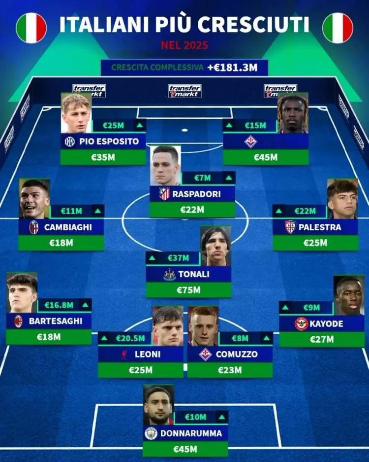 德转统计了2025年意大利球员身价上涨最佳阵容• 🌟 涨幅前三:托纳利+3700万欧、皮奥·埃斯波西托+2500万欧、莱奥尼+2050万欧• 💰 身价前三:托纳利7500万欧、多纳鲁马/小基恩各4500万欧• 🧑🤝🧑 分布:英超4人、意甲5人、西甲1人、英超+意甲合计9人,呈本土+海外双线崛起态势
