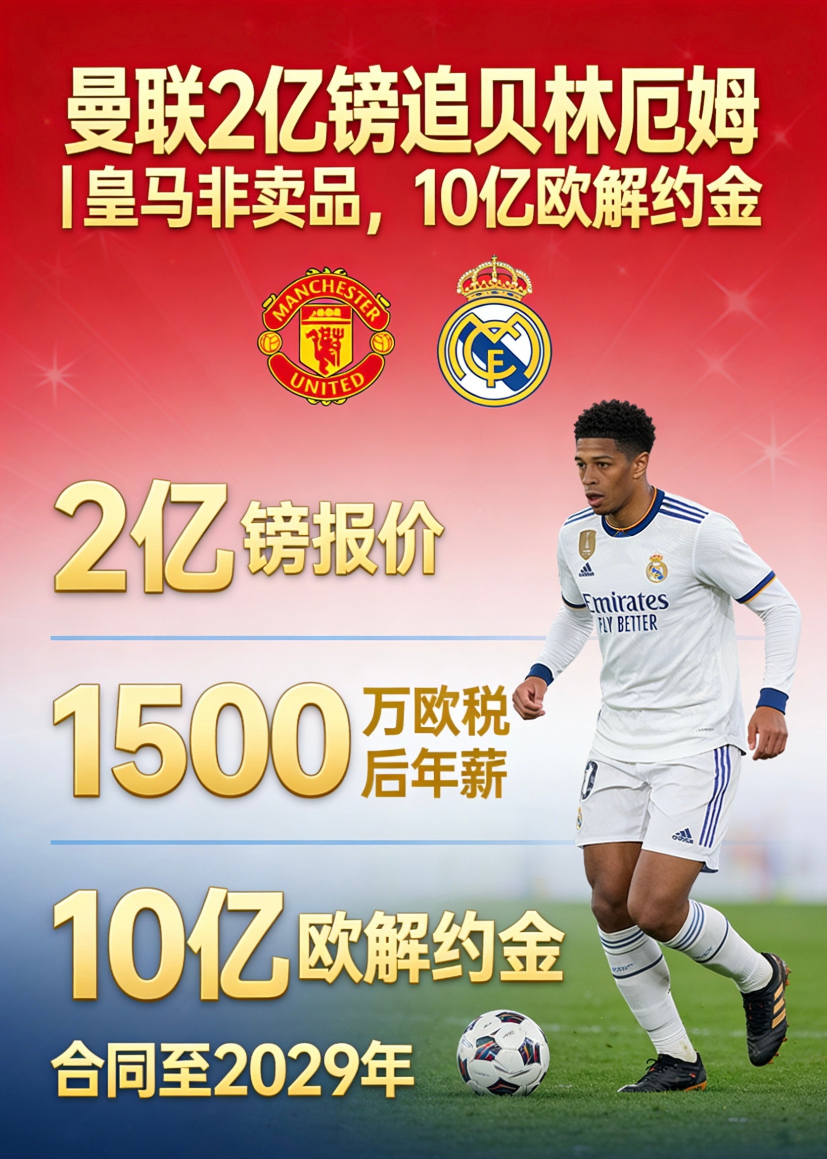 核心信息速览(西媒okdiario爆料,2025-12-27)• 曼联报价:夏窗拟向皇马报2亿镑(约2.32亿欧),给贝林厄姆6年税后1500万欧年薪(约为皇马当前收入的两倍),定位下赛季当家球星。• 交易硬障碍:贝林厄姆与皇马合同至2029年6月,解约金10亿欧(无法强行激活);球员无离队意愿,皇马将其列为非卖品。• 可行性判断:交易成功率极低——皇马不会放核心,球员无动力离队,报价与解约金/皇马心理预期差距过大。