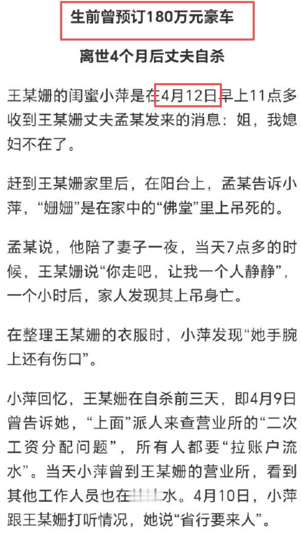 银行女经理自杀储户千万存款被转走这案子有个细节很蹊跷,挪用储户金额达3000万,还借了4个朋友1000万,动机之一是炒股理财,被发现自杀时间是4月12日,再往前数几天就是4月7日,熟悉全球资本市场的都知道那几天发生了什么,虽然后面反弹回来还开启慢牛,但如果在最低点爆亏割肉心态肯定崩溃。亏自己的钱也就罢了,如果是储户和朋友的本钱,窟窿根本填不完。银行内审也形同虚设。按常识,这些年普通人转账金额多一点,都会被银行提示甚至限额,怎么这家银行的员工就能畅通无阻的挪用如此庞大的金额并逃过内审?另外,当地商丘监管还回复过“暂无法认定银行存在违规行为”,整件事都充满了戏剧性。36岁银行女经理和丈夫先后自杀自杀银行女经理生前月薪五六万