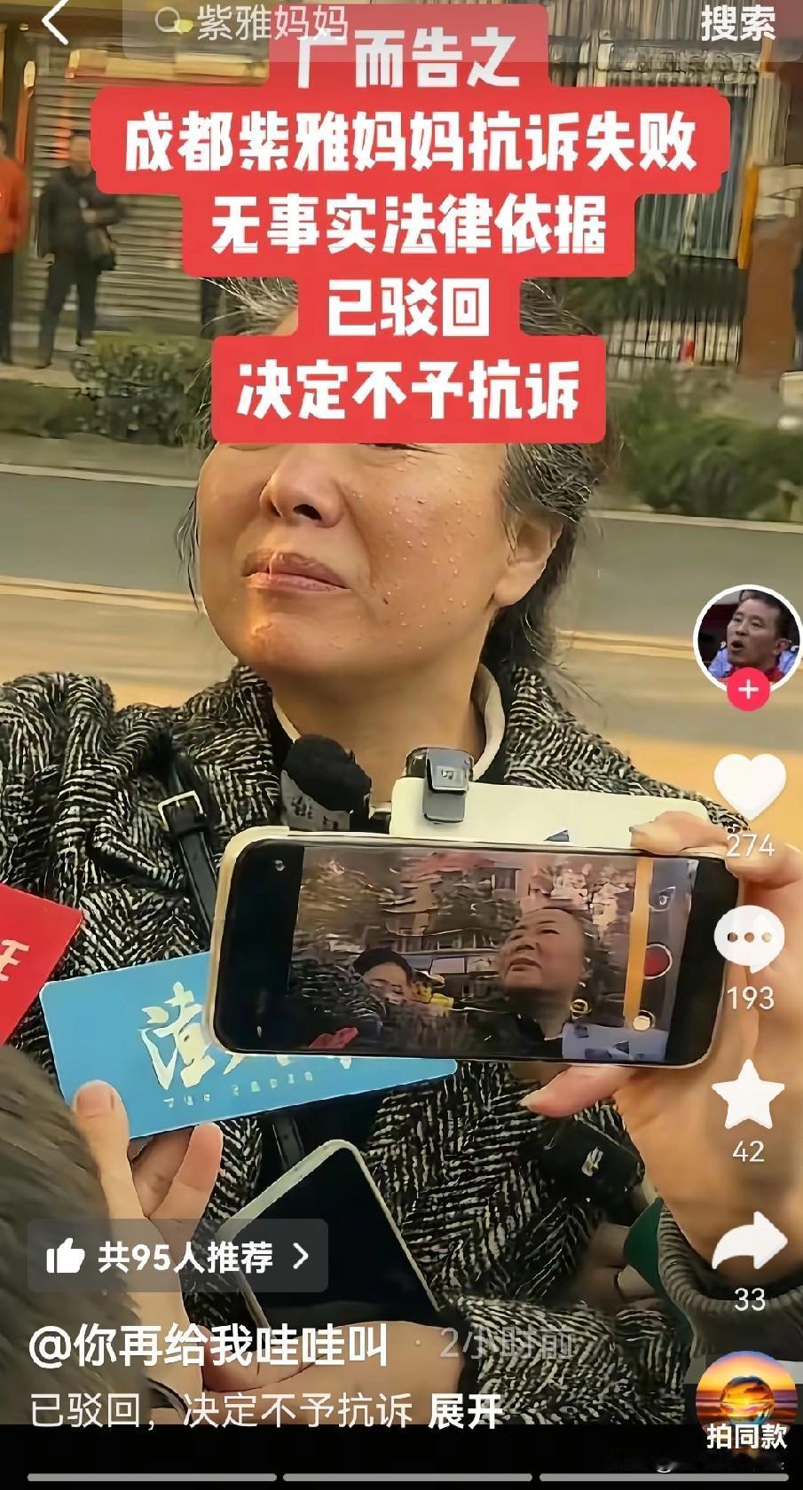 紫雅妈妈抗诉失败了!疑似被告人父亲开心发布视频公布消息还内涵辱骂紫雅妈妈,张狂恶毒至极! 据网传聊天记录,今天下午19时15分,紫雅妈妈在粉丝群怀着无比悲痛的心情回应网友们关心,称:抗诉没有通过,让大家失望了!目前只有疑似账号称:紫雅妈妈抗诉被驳回是因为无事实法律依据,官方还没有通报。 这样的结果真的太让人意难平了,紫雅妈妈该有多伤心!而反观被告人一家,杀害了人家的女儿不仅没有丝毫内疚歉意,还猖狂无耻地辱骂人家妈妈,实在是卑劣可恶至极! 既然结果无法改变,希望紫雅妈妈能够尽快走出悲痛,无论如何,生活还要继续,紫雅在天上看着,也不希望妈妈一直困在其中,人力不能解决的事情就交给天意吧,相信善恶终会有报!