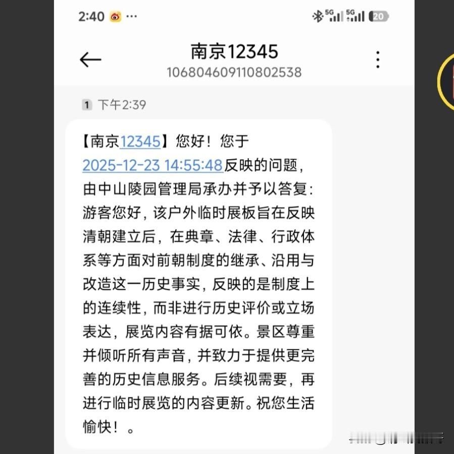 一网友发视频称,自己在南京明孝陵里面看到关于其他朝代皇帝的介绍,于是向南京12345致电反映问题。后面短信回复说,这是这只是一种展览,是为了说明朝代更迭的连续性,并非表达立场。 我没去过明孝陵,不知道这个网友所说的这种宣传板里面的内容涉及了多少朝代,如果有很多与明孝陵相关的,这个解释就说的通了。 你们去过明孝陵的朋友,有留意这个事吗?