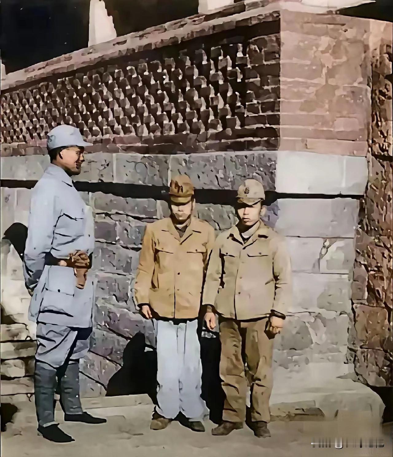 照片中老老实实站在墙边的是抗日战争时期被八路军俘虏的两名日军。 当时俗称“小鬼子”。