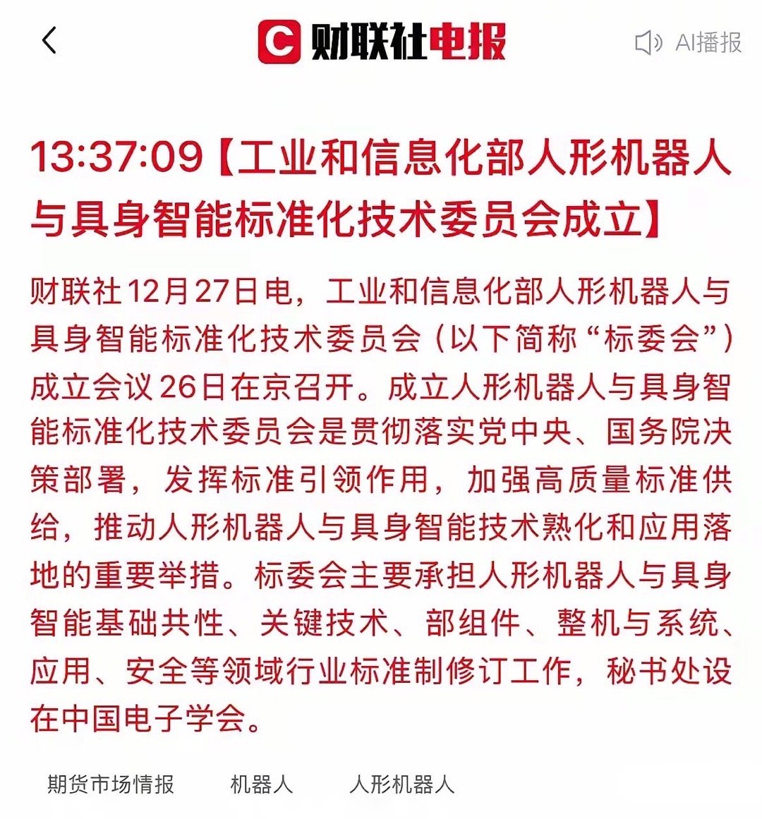 人形机器人赛道再迎政策利好!工信部定标准,这些核心A股公司迎关键机遇!近日,工信部成立“人形机器人与具身智能标准化技术委员会”,推动产业从研发迈向规模化应用的关键一步。行业统一“规则”即将确立,产业链发展迎来明确指引。核心受益方向梳理:丝杠(核心传动部件): ·五洲新春:开发灵巧手微型丝杠,已供货博世、拓普集团等客户。 ·秦川机床:掌握高精度磨削工艺,适配特斯拉Optimus等主流机型。·贝斯特:产品进入特斯拉、华为供应链。·恒立液压:线性关节模组已向特斯拉送样。·金沃股份:拟在泰国投资建设行星滚柱丝杠及配件生产基地。减速器(关键旋转部件): · 绿的谐波:国内谐波减速器龙头,机器人业务收入占比超80%。 · 汉宇集团:拥有谐波减速器产能。 ·斯菱股份:聚焦谐波减速器研发与量产,股价年内表现活跃。电机(关节驱动核心): · 步科股份:国内无框力矩电机龙头,已推出第四代产品。 · 微光股份:公告其无框力矩电机已实现量产。 · 雷赛智能:已实现高密度无框力矩电机量产。机器视觉(3D视觉传感器): · 奥普特:工业视觉核心部件龙头,产品包括3D视觉传感器。 · 奥比中光:国内3D视觉领军企业,在服务机器人视觉市场占有率超70%。 ·凌云光:在机器视觉系统集成与核心部件领域均有布局。AI芯片与解决方案: · 全志科技:为扫地机器人等终端提供AI芯片,并已实现大规模量产。这不仅是一次政策催化,更是产业从“0-1”迈向“1-10”的里程碑。标准统一后,产业链协作成本有望大幅降低,技术领先且能快速适配标准的公司,将赢得市场扩张的先发优势。