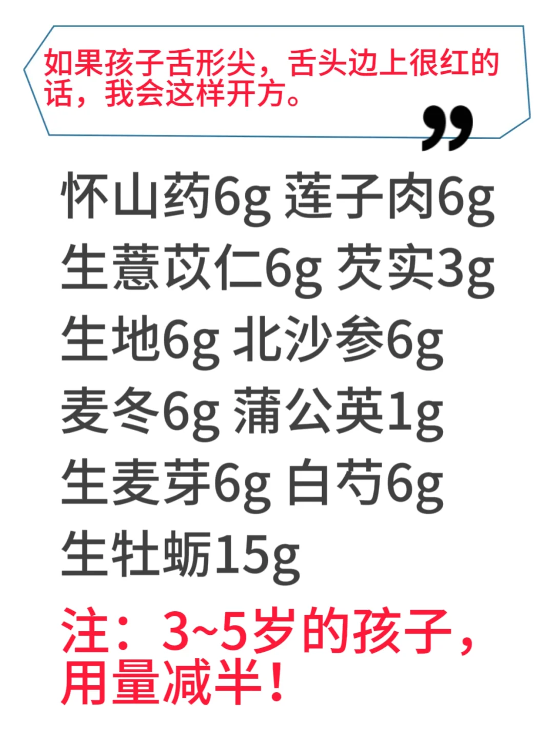 如果孩子舌形尖,舌头边上很红的话,我会这样开方。