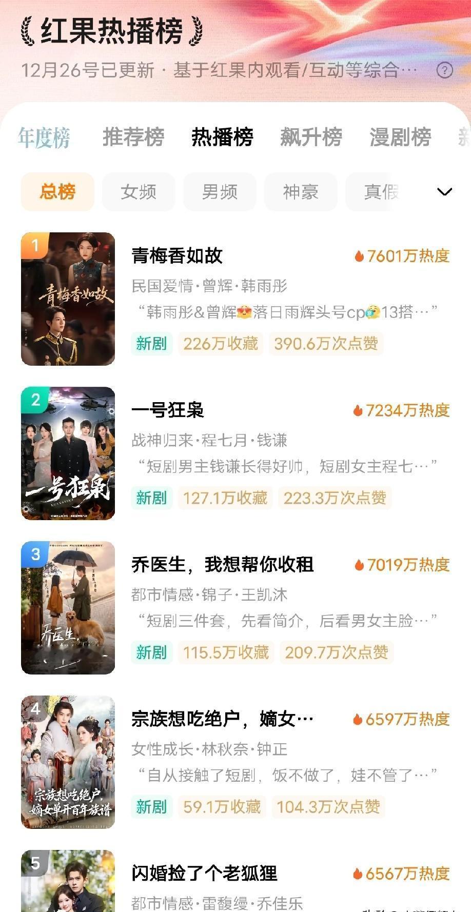 别再拿自己两小时试错了。 算法已经把答案摆在榜首。 短剧市场今年冲过300亿门槛,每天上线新剧比你刷到的还多。 但数据不会骗人:排行榜前十名的作品,平均完播率钉死在85%以上。 这意味着什么? 一百个人点开,八十五人会咬牙看到最后一帧——你的时间不该浪费在剩下的十五部烂片上。 平台算法刚完成升级。 现在每60分钟重排一次名次,热度流动像心跳一样实时。 《青梅香如故》连续霸榜七天不是偶然,它每分钟都在经受新一轮点击考验。 紧随其后的是《职场生存法则》,把办公室政治压进三分钟快节奏反转;《午夜来电》用悬疑钩子吊住观众,每集结尾都像在喉咙口轻轻挠一下。 你不需要成为筛选专家,只需要看懂系统用亿万次点击替你完成的筛选。 那些能挤进前三的剧本,早就跨过了“节奏拖沓”、“演技尴尬”、“逻辑崩盘”三道鬼门关。 好内容自己会奔跑,而你的时间值得留给已经冲过终点线的选手。 选对榜单,比刷完片单更重要。