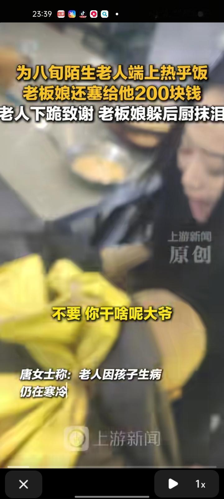 12月26日,黑龙江七台河。82岁老人被店主帮助后,激动得下跪致谢,被店主连忙拦住。店主躲在后厨,偷偷抹泪。 店主唐女士称,老人因孩子生病,仍在寒冷天气中奔波。得知情况后,不仅给老人热粥添饭,还去附近的银行取200元塞到他手里