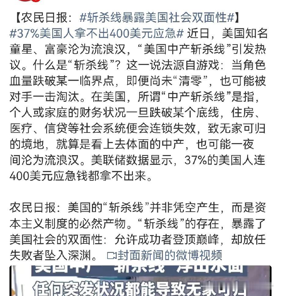 “斩杀线”?“斩杀线”! 到底什么是美国的斩杀线? 都火🔥了好几天了,我也没跟上节奏,不过,现在彻底把它搞懂也不晚。 如果还不清楚的网友,请看完农民日报的这篇解读,你心里可能就一清二楚了。总之可见,美国处于“斩杀线”附近的人可不少啊。要不怎么会发明这么一根线呢?