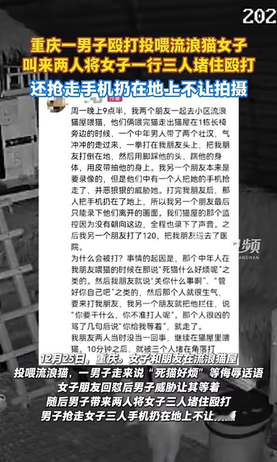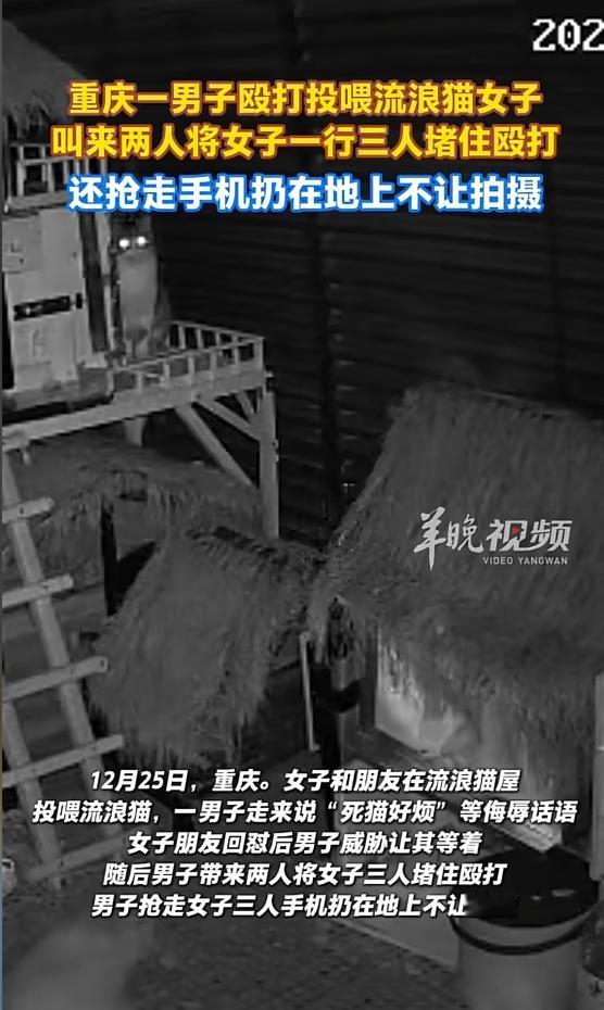 “必须严惩!”12月25日,重庆,一女子和朋友喂流浪猫时,听见路过的一名男子辱骂小猫,女子朋友回怼后,男子威胁让她们等着,随后带来两人将女子三人堵住殴打,还把她们的手机抢走不让拍摄。网友:简直是恶霸! 一名男子路过时看到地上的小猫,不仅没有半分怜悯,反而恶语相向,嘴里骂着“死猫真烦”,这话换谁听了都不舒服,更何况是真心想帮小猫的几位姑娘,同行的朋友便忍不住回怼了一句,大意是这事与他无关。 没成想就这一句正常回怼,竟彻底激怒了男子,一个大男人就因为被旁人反驳了一句,当场就急了眼,撸起袖子就要冲上来动手。好在几位女子反应快,一边呵斥一边阻拦,明确告诉他不准打人。 男子见状,或许是意识到自己单枪匹马,对方有三个人,未必能占到便宜,便放下一连串脏话,撂下一句狠巴巴的“给我等着”,转身离开了现场。 姑娘们当时以为这不过是一次不愉快的小插曲,男子只是虚张声势,骂够了就走了没往心里去,出于对流浪猫的惦记,她们也没立刻离开,依旧留在原地继续照顾小猫,可她们万万没想到,人性的恶竟如此毫无底线,这短短十分钟的停留,竟成了对方召集人手、酝酿报复的时间。 仅仅十分钟,噩梦就降临了,那名男子果然回来了,而且不是孤身一人,身后还跟着两名身形魁梧的壮汉,原本只是口角争执,瞬间变成了力量悬殊的恶意欺凌,三个身强力壮的大男人,直接把三位手无寸铁的姑娘堵在角落里,对着她们拳打脚踢,这哪里是一时冲动的冲突,分明是一场有预谋、有组织的报复性殴打。 更让人不寒而栗的是,这伙人施暴时还格外“有心计”,怕自己的恶行被记录下来留下证据,动手的同时,他们还抢走了姑娘们的手机,狠狠摔在地上,就是为了阻止她们拍摄取证。一边是对着柔弱女性下手的狰狞模样,一边是怕恶行曝光的做贼心虚,两种丑态交织在一起,越发显得这伙人卑劣不堪。 细想下来这伙人的行径全是不堪。,着不会说话的流浪猫恶语相向,能看出他们心胸狭隘、戾气深重,被姑娘回怼后就想动手,是典型的欺软怕硬,自己一个人不敢逞强,就叫人来以多欺少、以男欺女,更是懦夫行径的极致体现,把浑身的劲头都用在欺负弱小女性身上,半点男人的担当和体面都没有。 这事在网上发酵后,网友们的愤怒溢于言表,纷纷怒斥这伙人就是恶霸,大家愤怒的不只是这起冲突本身,更是这伙人对善意的践踏和对法律的漠视,好心喂猫本是善举,却因为一句回怼就遭此毒手,若这样的恶行得不到遏制,社会的安全感何在? 寒冬里的气温再低,也抵不过这起事件里的恶意让人刺骨,姑娘们蹲在地上喂猫的身影,本是冬夜里的一抹暖阳,却被这伙人的拳头狠狠打碎,无论起因如何聚众围殴女性、抢夺手机毁灭证据的行为,早已突破了道德底线,更是对法律的公然挑衅。 这样的恶霸绝不能姑息,必须严惩不贷!只有让他们为自己的恶行付出应有的代价,才能平息公众的怒火,才能守住社会的公序良俗,也才能让每一个心怀善意的人,都能安心地传递温暖,不用再担心因一份善举而遭致无妄之灾。 (信息来源:《重庆一男子殴打投喂流浪猫女子,叫来两人将女子一行三人堵住殴打,还抢走手机扔在地上不让拍摄》羊城晚报)