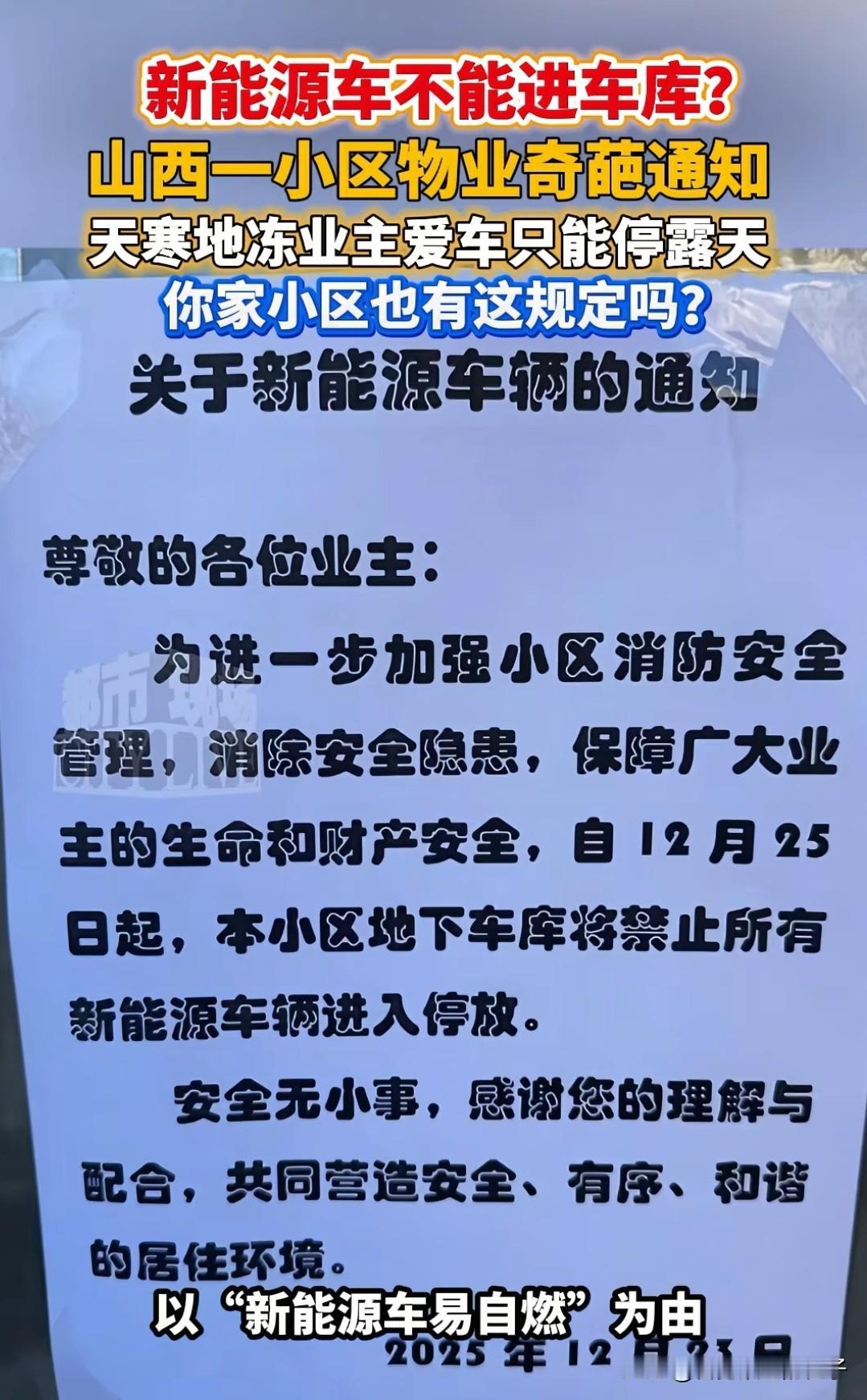 太闹心了!近日,山西某小区的业主发现自己的车进不去地库了,找到物业询问才得知,不是因为没交停车费,而是从12月25日起,所有电车都禁止停放在小区地下车库内,理由是新能源汽车容易自燃。 但业主并不同意这个说法,有业主说他查过汽车的自燃数据,实际上电车的自燃率是远低于油车的,花钱买的车位凭啥不让停,难道电车就只配停在室外? 物业这个做法确实有点不讲理了,车位是属于业主的,停什么车还要经过物业同意,退一步说,买车位的时没有告知新能源车不能停,事后却告知不能停,那也应该把钱退给业主。 而且新能源车不能停地下车位,并没有有相关法律法规吧,物业还能自创? 大家怎么看呢?