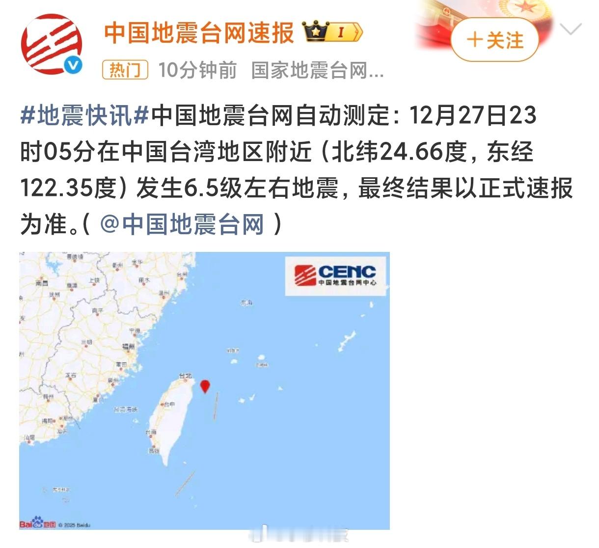 新疆地震台湾6.5级左右地震今天凌晨三点多,新疆发生3.6级小地震,今天晚上11点多,台湾发生6.5级中级地震,这两个地方相隔几千里,应该没任何联系,不过遇到地震,大家一定要谨慎,注意安全新疆地震