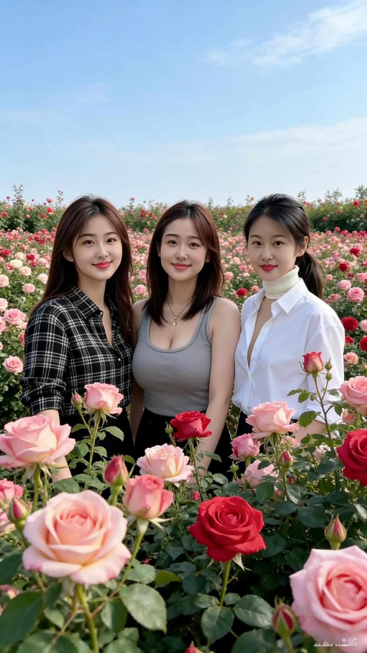 三位女性分别穿着黑白格衬衫、灰色背心和白色衬衫配高领内搭,长发、中长发与马尾各显特色。她们在盛放的牡丹园微笑互动,洋溢着温暖与自然的生活气息。