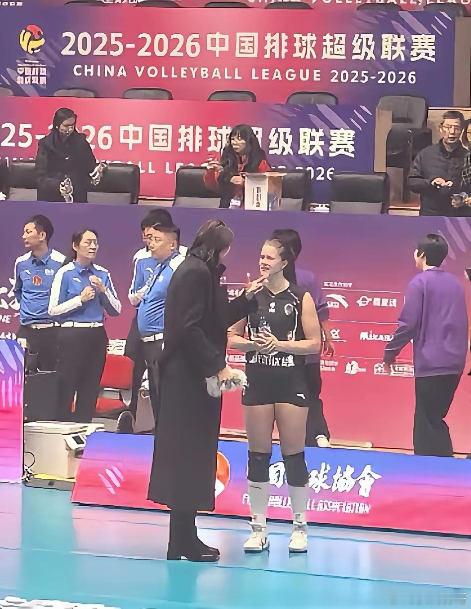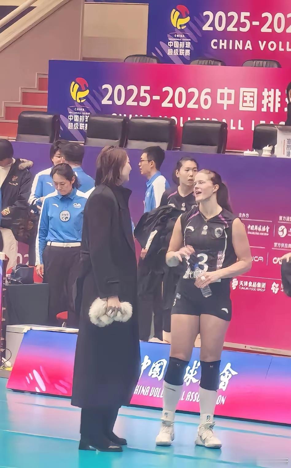 图1、图2、图3为袁心玥赛后与上海外援范赖克热聊。范赖克是24-25赛季袁心玥在瓦基弗银行女排时的队友。一年之后范赖克来到中国打球,而袁心玥已成为天津南开大学的体育老师。今天范赖克打得有些窝火,一个马尾辫触网让她非常不爽。图4为上海女排两名年轻副攻陈厚羽王奥芊与袁心玥合影。在她俩心目中,奥运冠军袁心玥肯定是她们的超级偶像。