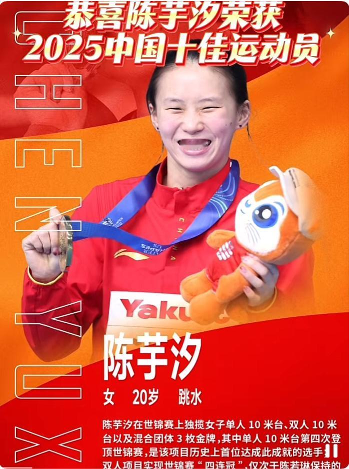 新华社认证的“十佳”, 陈芋汐凭什么稳坐C位? 新华社2025年全国体育十佳名单一出,大家心里就一个字:稳! 看看这名单,石宇奇、孙颖莎、苏翊鸣、 覃海洋、邹敬园…… 哪个不是各自领域的顶流? 但陈芋汐的名字在里面, 一点都不突兀,反而觉得特别踏实。 为啥? 因为这份名单的入选核心, 她全都占满了,而且占得理直气壮。 先说硬核成绩一一 “世界大赛成绩突出”这条, 她简直是超标完成。 2025年, 她就是女子十米跳台的代名词, 走到哪,金牌就拿到哪。 这统治力,不服不行。 再看标杆价值一一 这才是她最不一样的地方。 她赢的,早就不是一场比赛了。 她用20岁的年纪, 把那个“20岁就走下坡路”的 跳水老魔咒,给彻底打破了。 这让后面所有练跳水的女孩子都看到了:天花板是可以捅破的, 路,可以走得更远。 所以说,这个“十佳”给她,实至名归。它夸的不只是14块金牌, 更是她身上那股 “我能、我行、我来打破它”的劲儿。 陈芋汐,早就跳出了跳水池, 成了咱们这个时代,年轻人该怎么拼、 怎么赢的一个活生生的标杆。 恭喜陈芋汐!这个十佳,你值得!