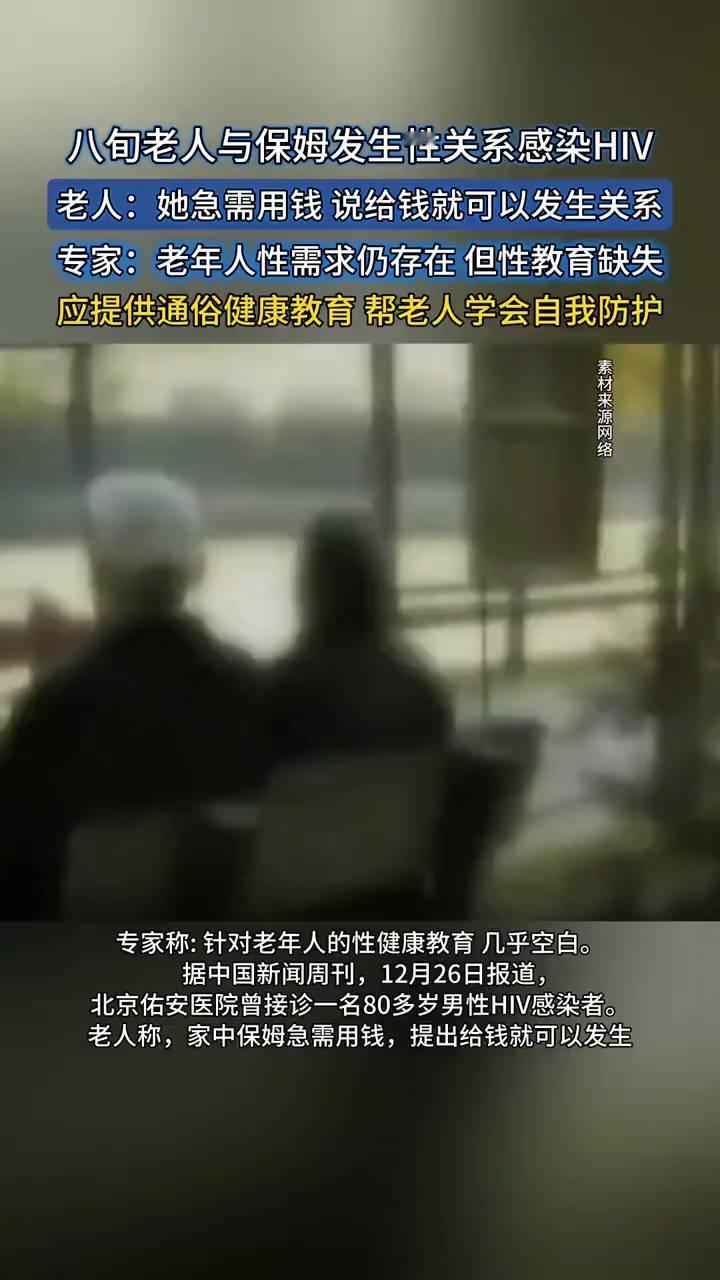 八旬老人与保姆发生性关系感染HIV。老人:她急需用钱,说给钱就可以发生关系。专家:老年人性需求仍存在,但性教育缺失,应提供通俗健康教育帮老人学会自我防护。 专家称:针对老年人的性健康教育几乎空白。据中国新闻周刊,12月26日报道,北京佑安医院曾接诊一名80多岁男性HIV感染者。老人称,家中保姆急需用钱,提出给钱就可以发生关系。