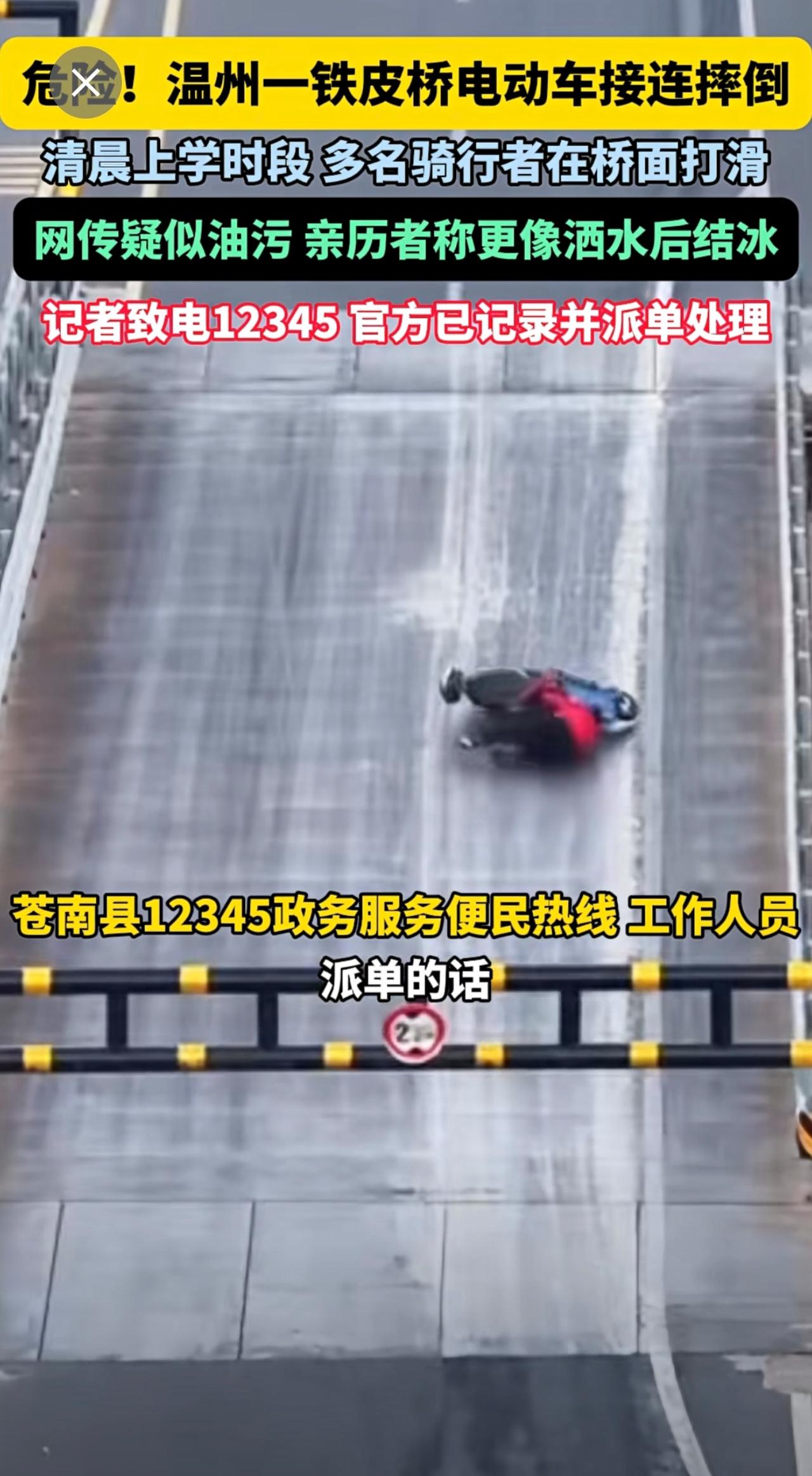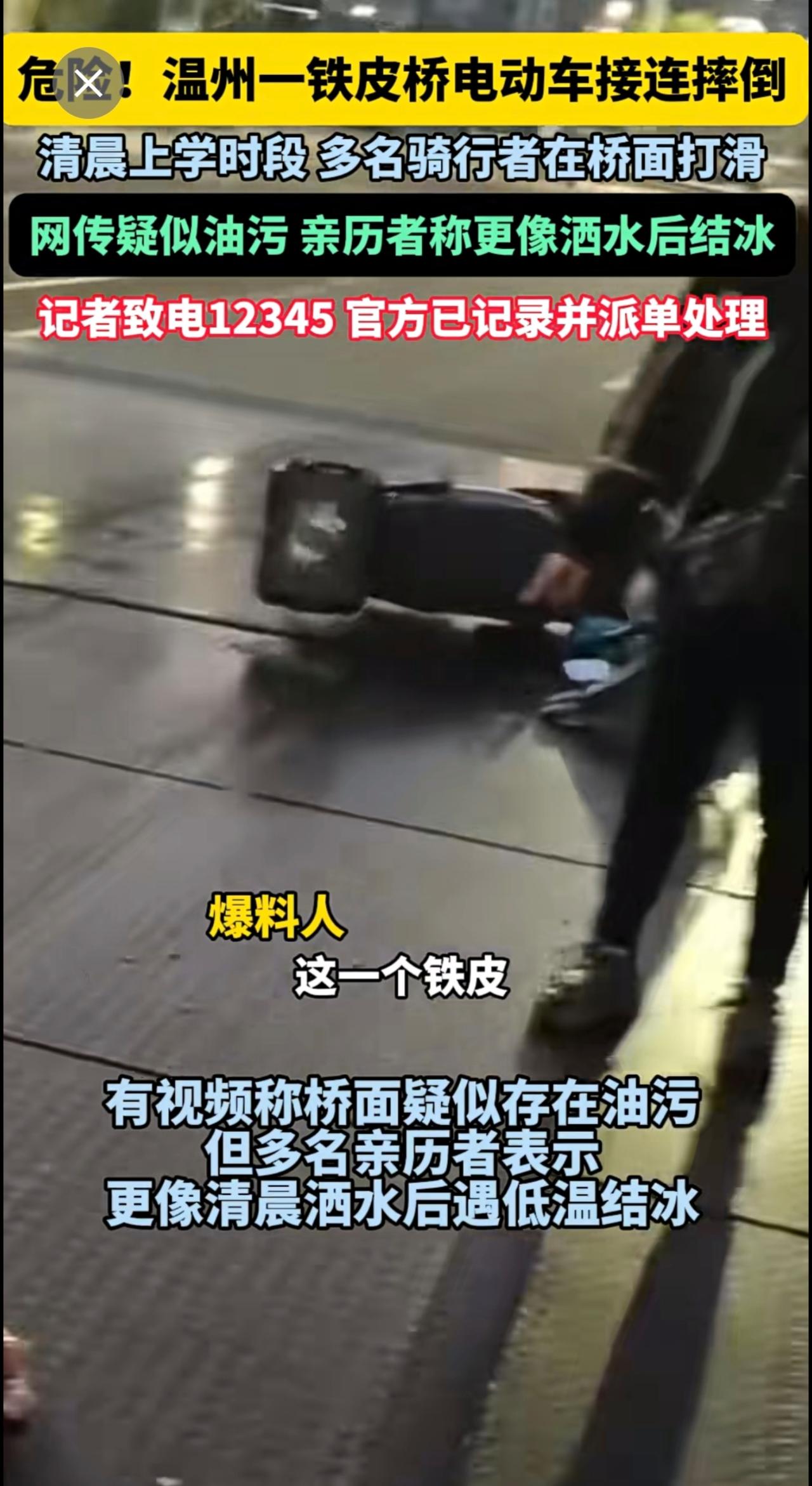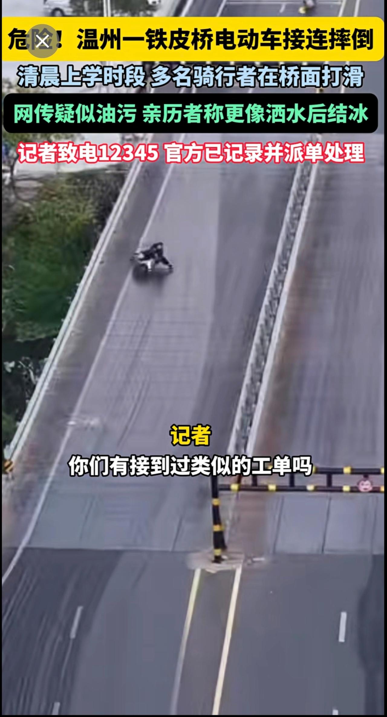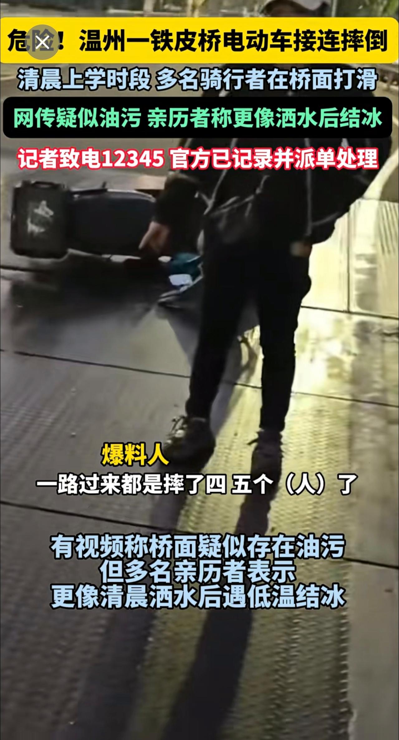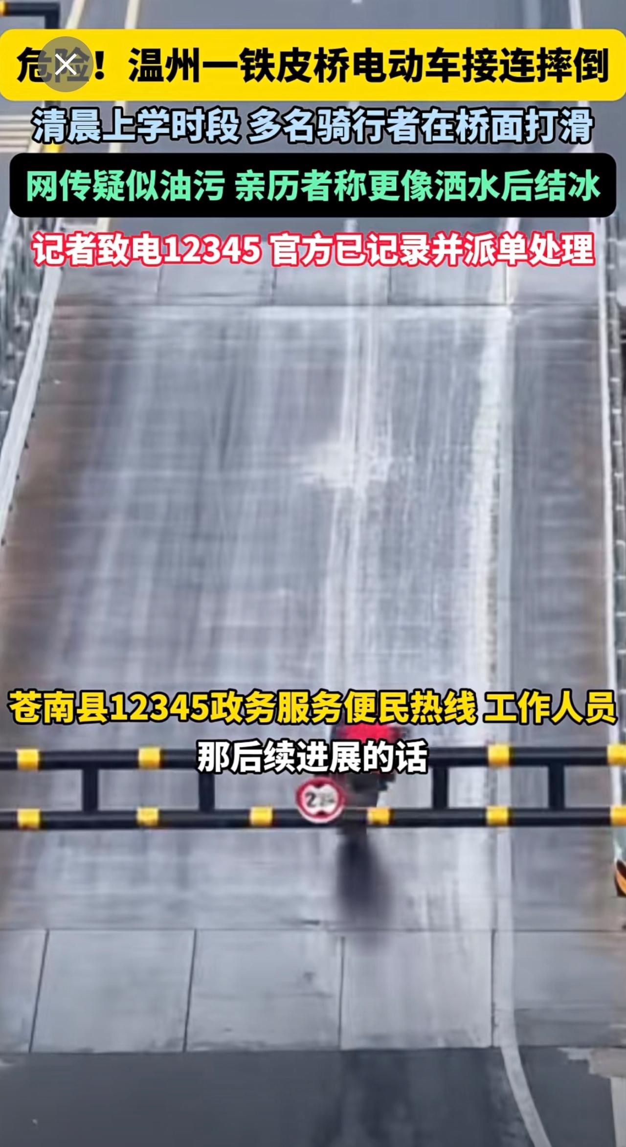 危险!温州一铁皮桥电动车接连摔倒 清晨上学时段 多名骑行者在桥面打滑 网传疑似油污 亲历者称更像洒水后结冰 记者致电12345 官方已记录并派单处理