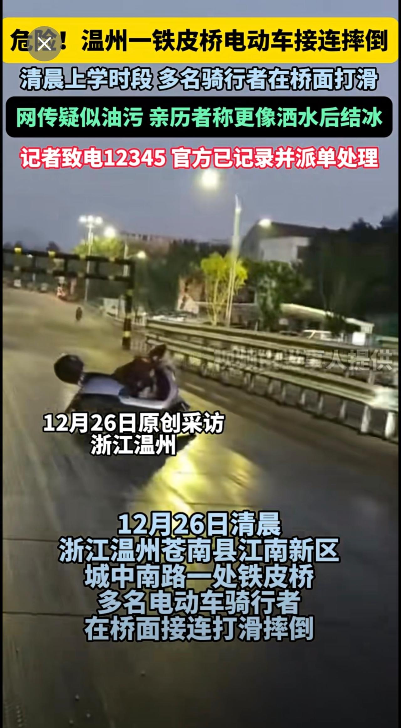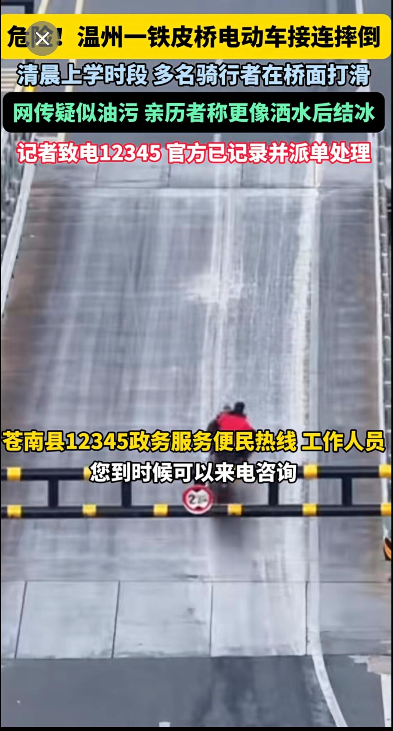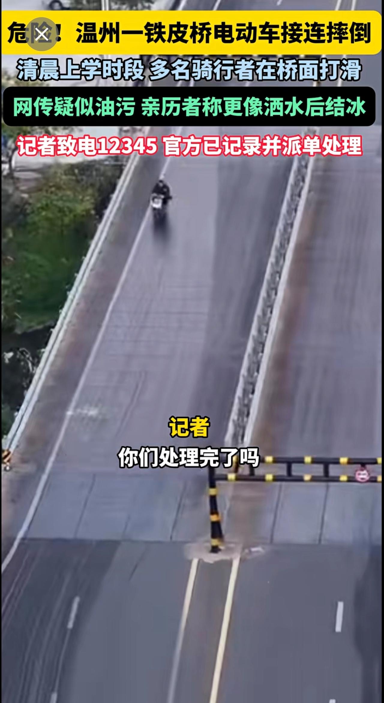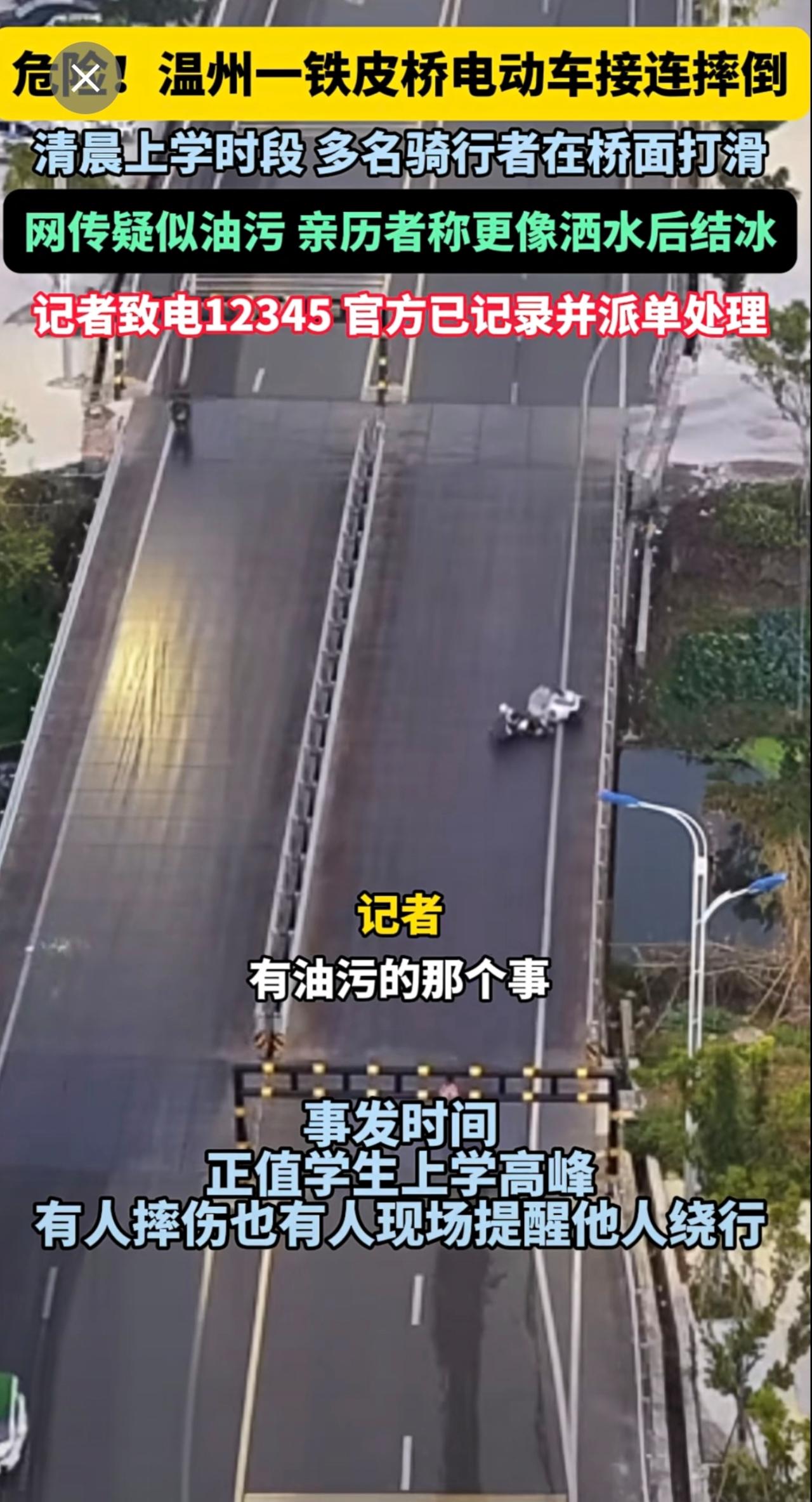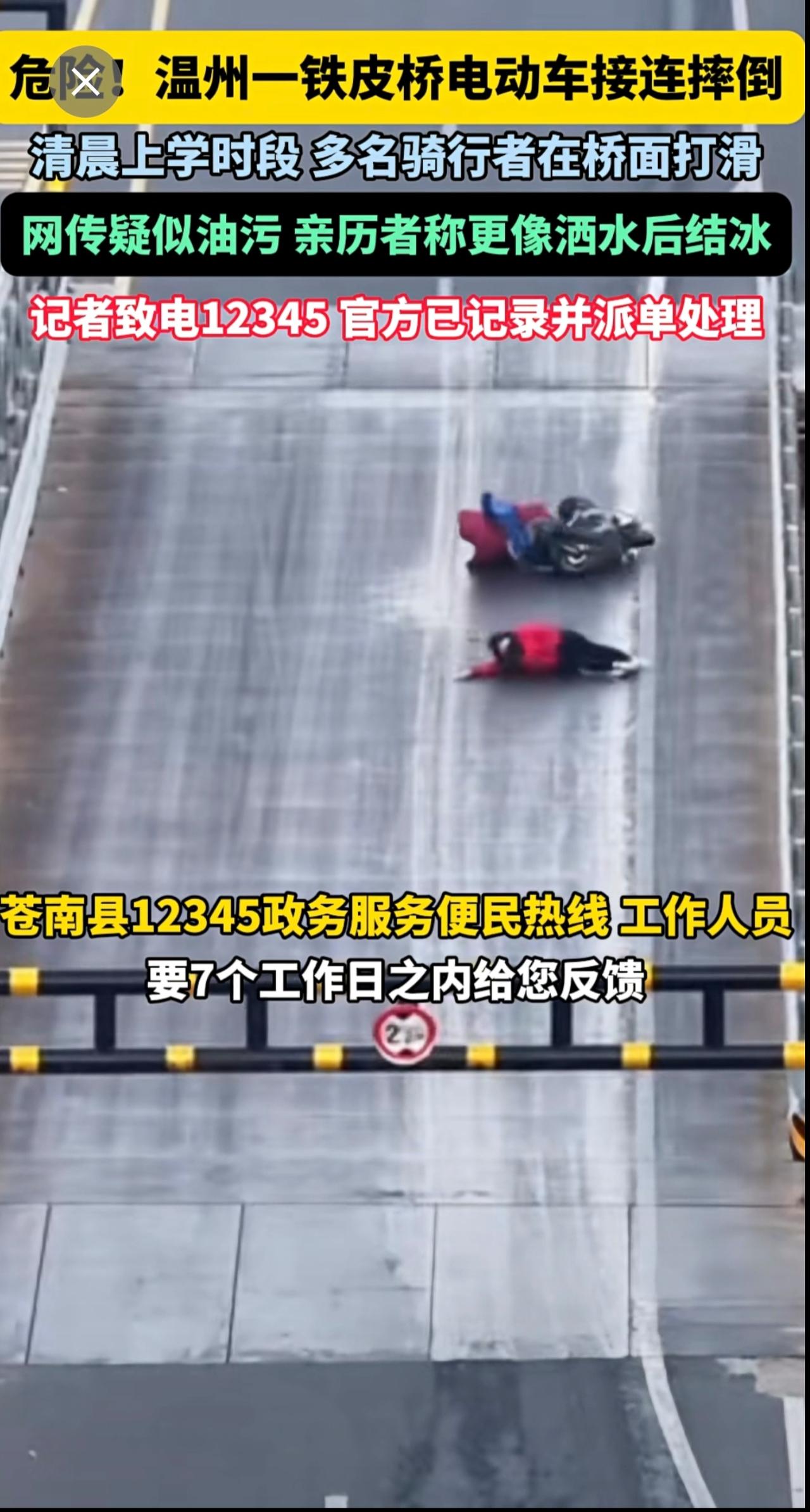危险!温州一铁皮桥电动车接连摔倒 清晨上学时段 多名骑行者在桥面打滑 网传疑似油污 亲历者称更像洒水后结冰 记者致电12345 官方已记录并派单处理