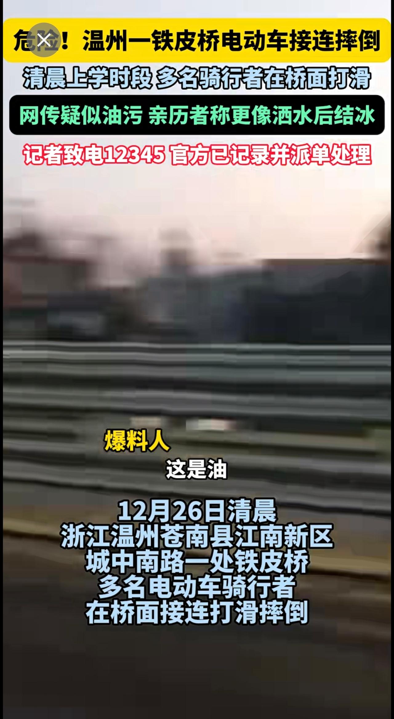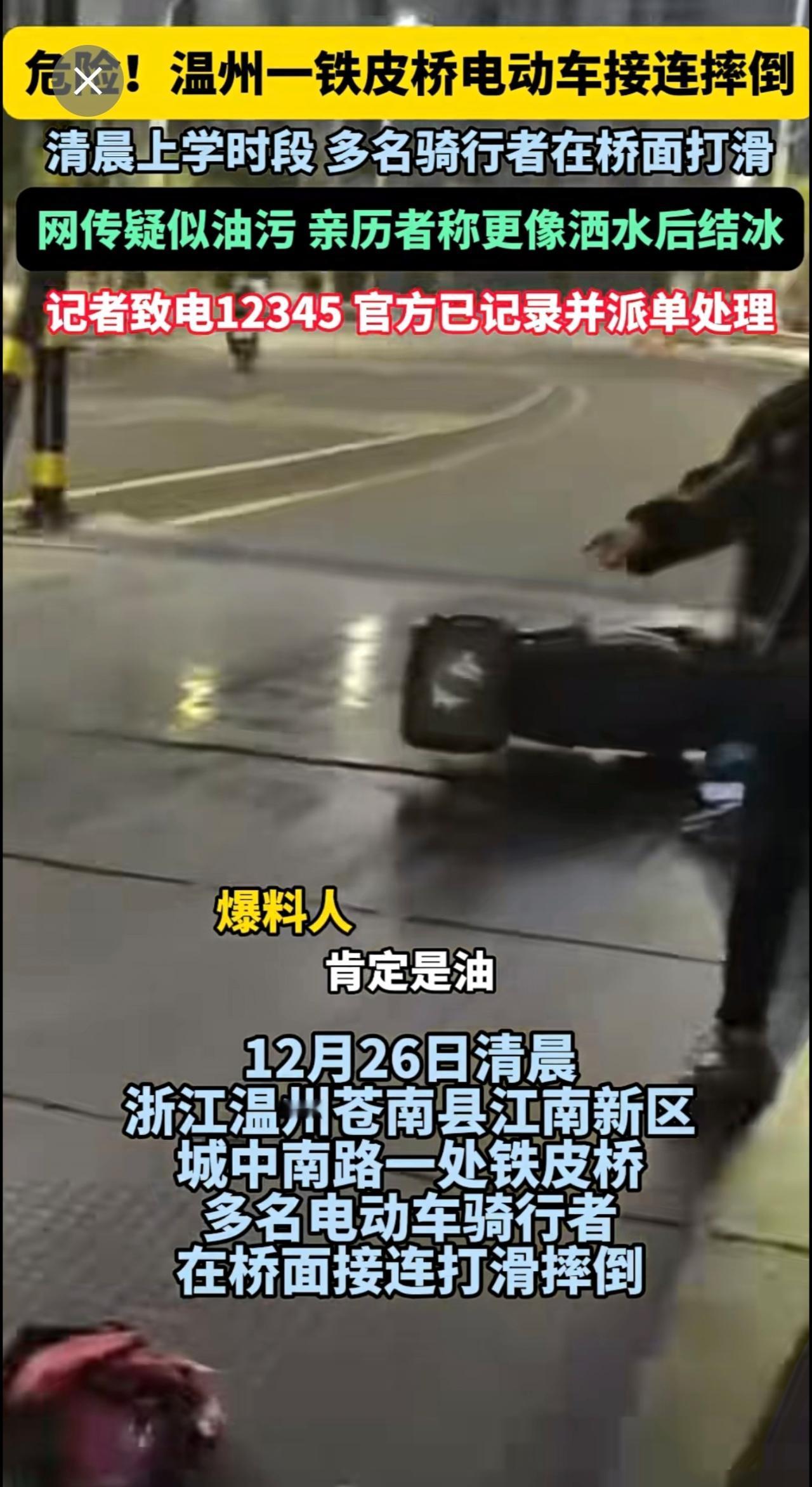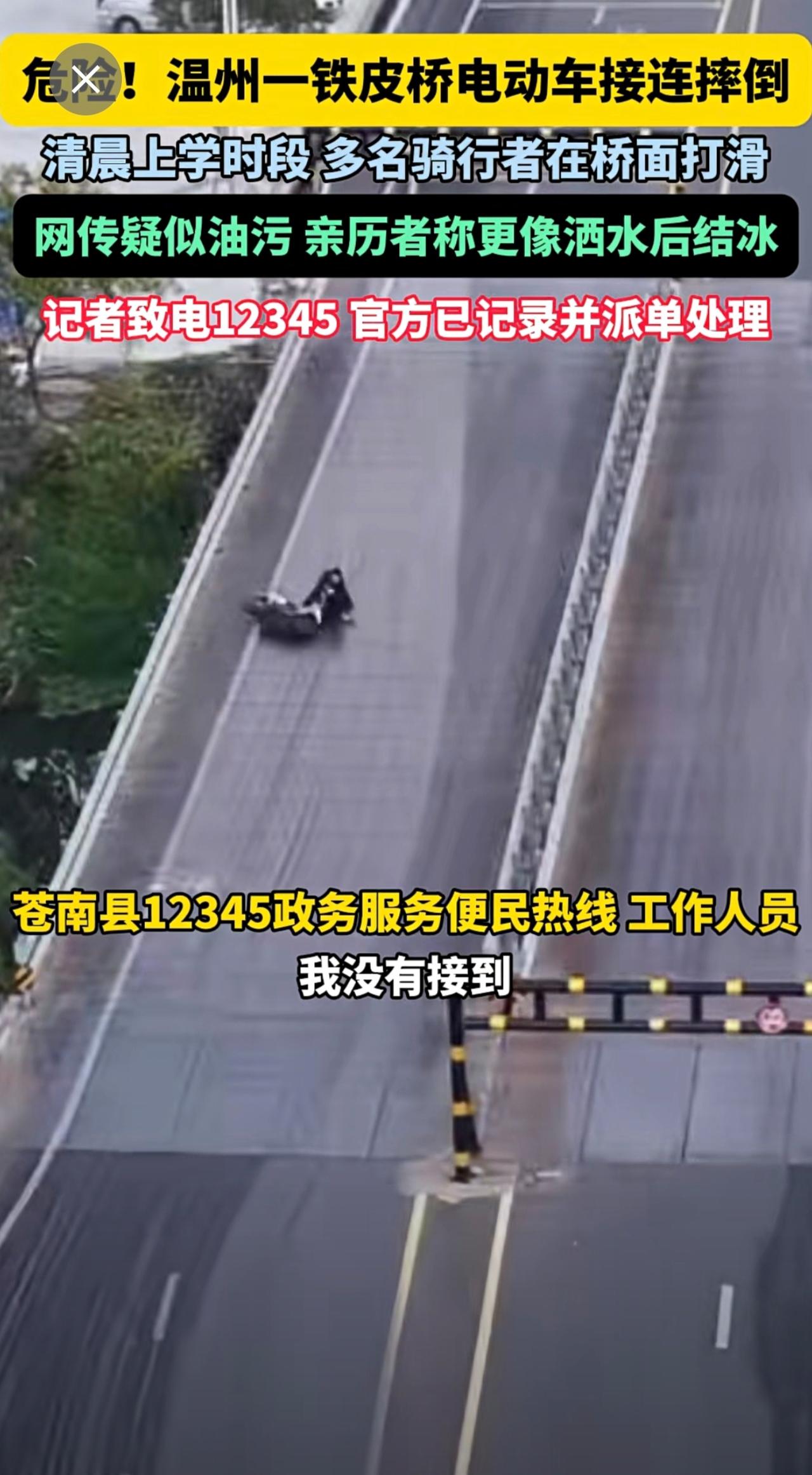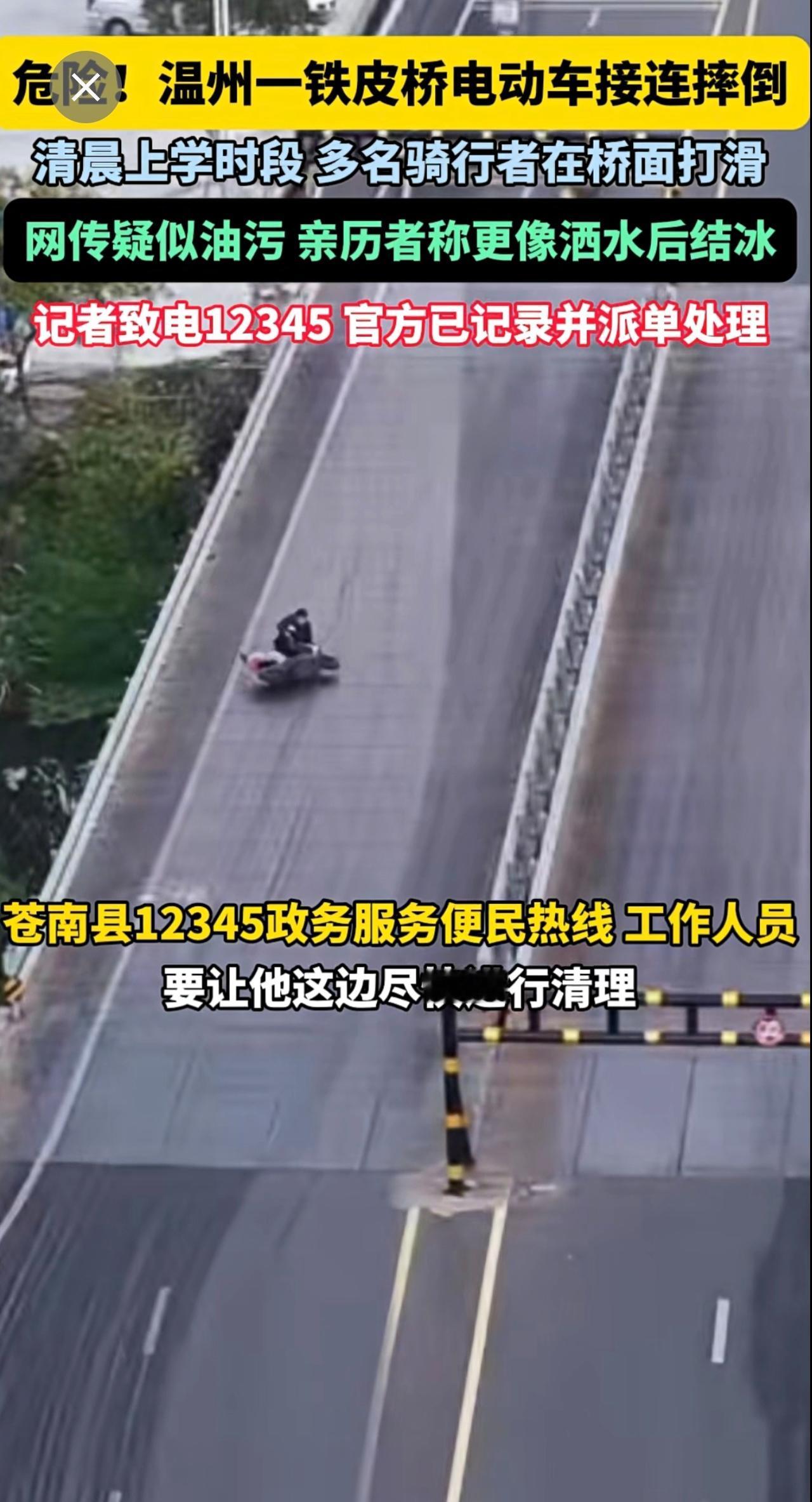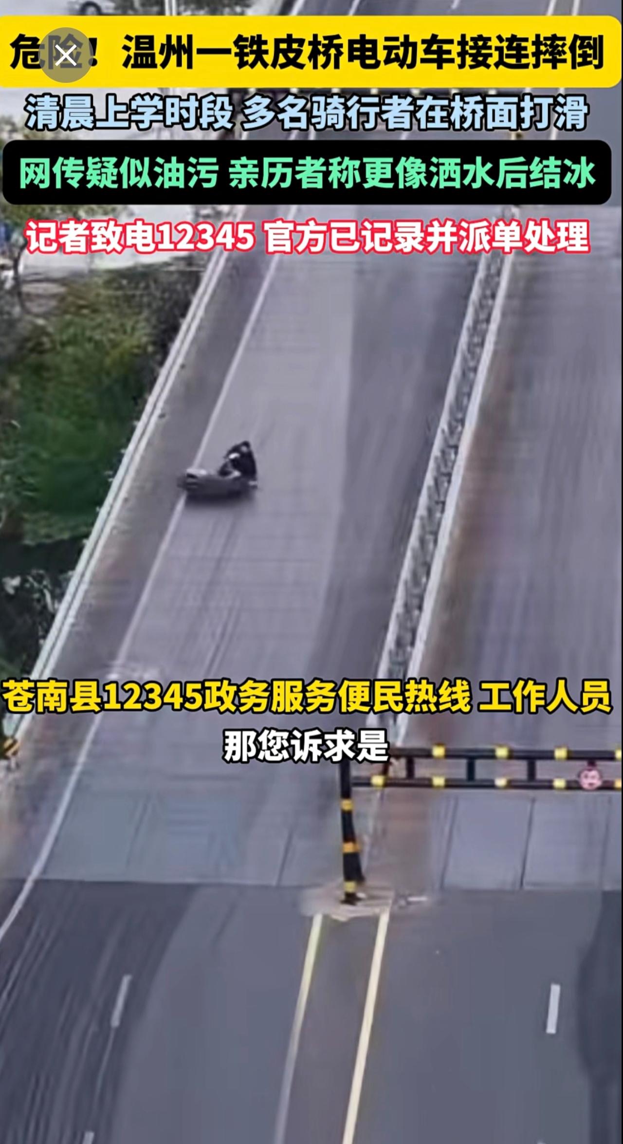 危险!温州一铁皮桥电动车接连摔倒 清晨上学时段 多名骑行者在桥面打滑 网传疑似油污 亲历者称更像洒水后结冰 记者致电12345 官方已记录并派单处理